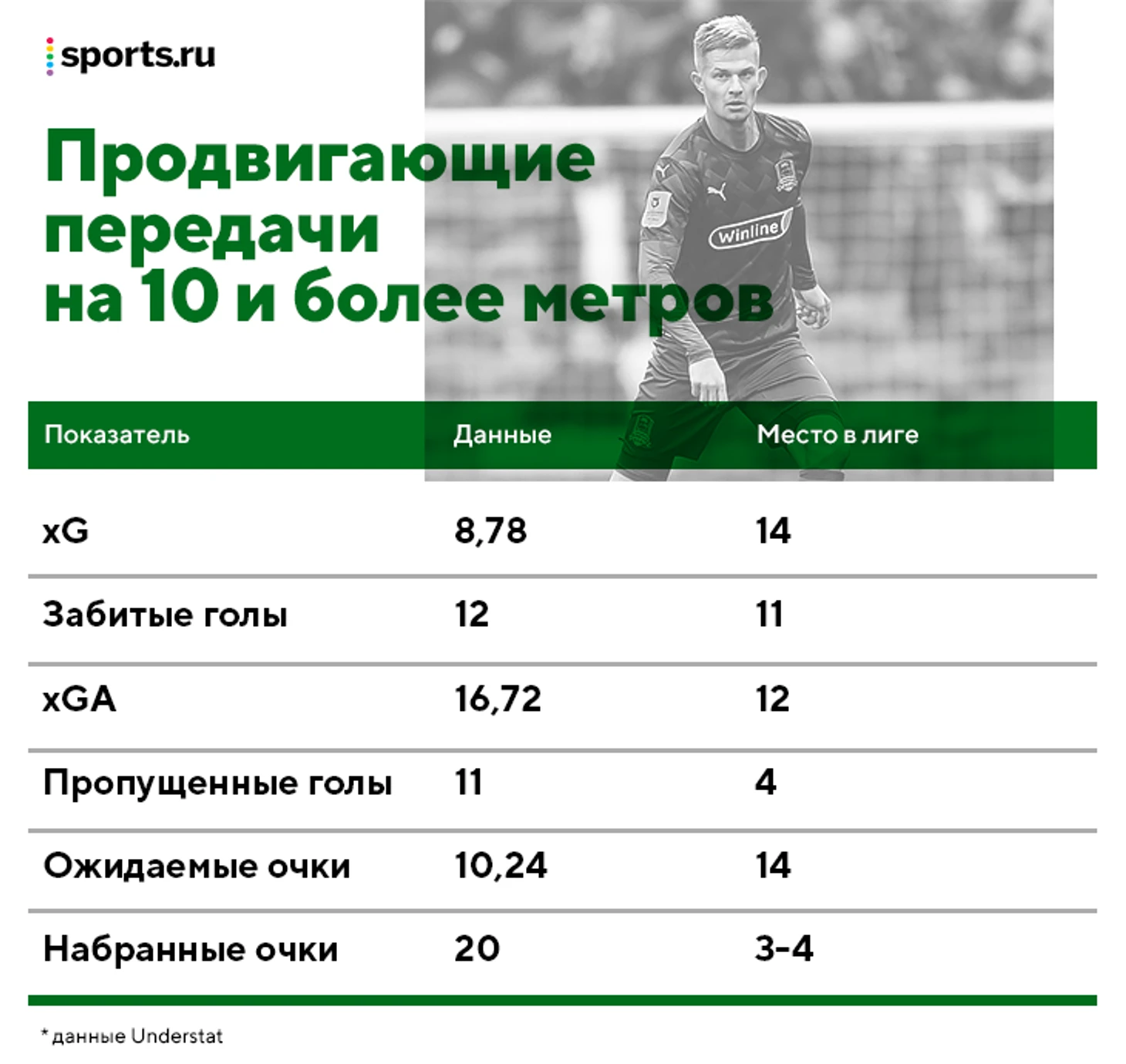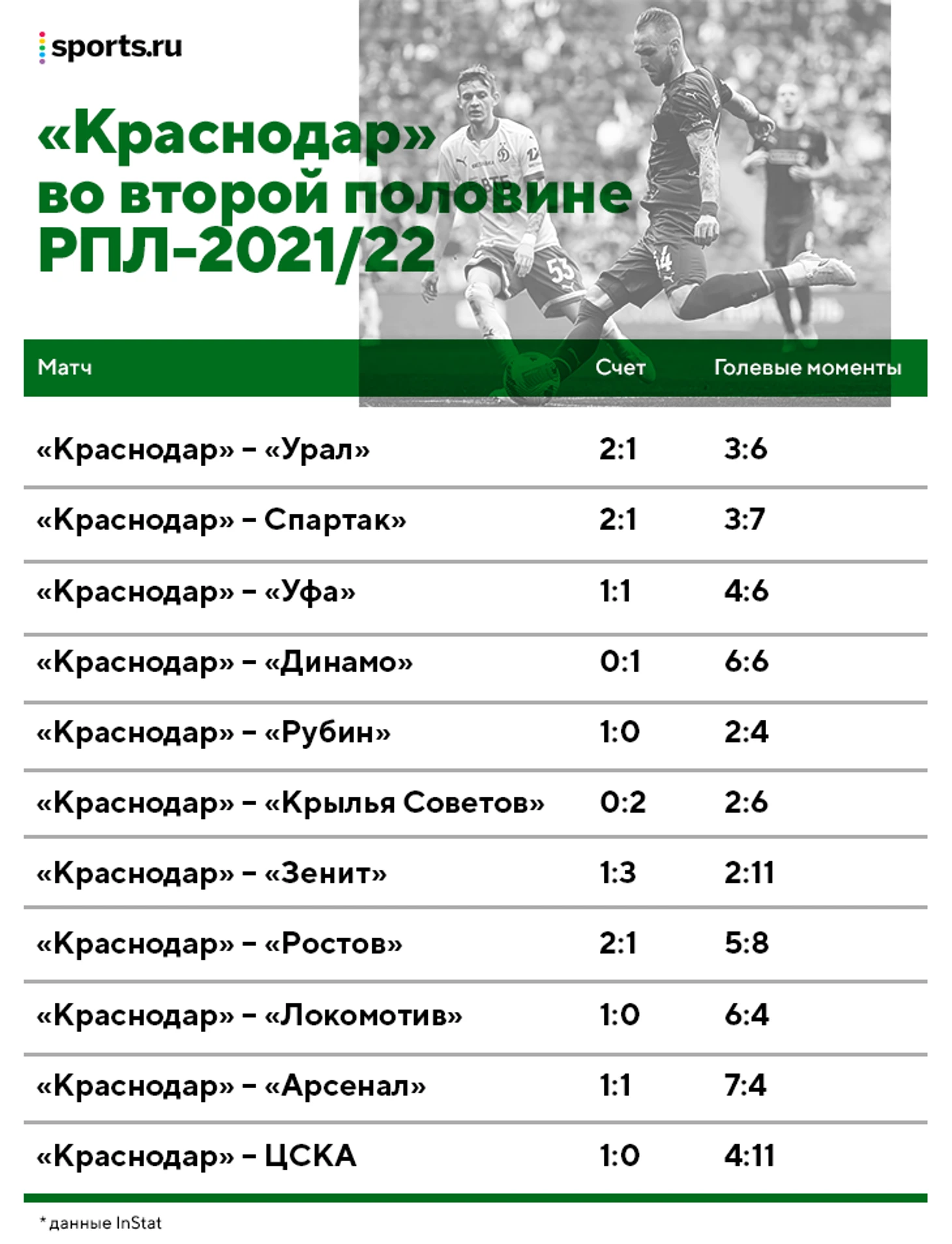 Перестройка сказалась и на обороне: краснодарцы допустили в полтора раза больше моментов и выдали внушительную разность между ожидаемыми забитыми и пропущенными голами – больше только у «Рубина» и «Арсенала». В итоге весенний «Краснодар» на 14-м месте по ожидаемым очкам (самое сильное расхождение в лиге).