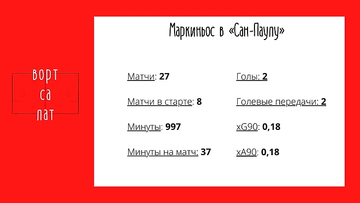 Вингер сыграл всего 27 матчей за два сезона во взрослом футболе. Среднее количество минут на матч составляет около 37. Феноменальной результативностью молодой футболист похвастаться не может. Любопытная информация (нерепрезентативно, для провокации): у Маркиньоса xG90 (ожидаемые голы на 90 минут) и xA90 (ожидаемые голевые передачи на 90 минут) выше, чем у Пепе в уходящем сезоне.