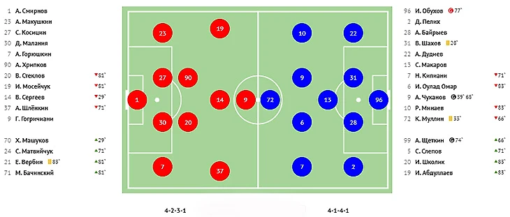 Голы: Баранов, 14 (0:1). Пруцев, 50 (0:2). Данилин, 56 (0:3). Пруцев, 85 (0:4). Дорофеев, 87 (1:4). Джозеф, 90+1 (2:3).