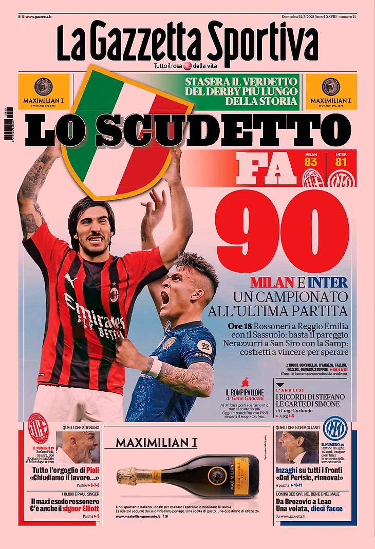 Скудетто за 90 минут. Заголовки Gazzetta, TuttoSport и Corriere за 22 мая