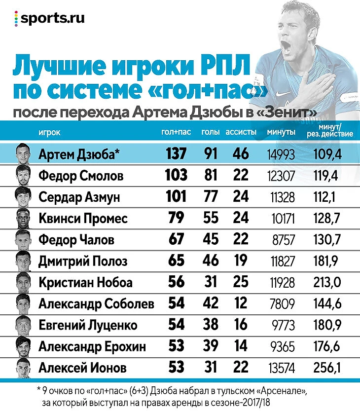 • у Дзюбы до «Зенита» хоть и было три действительно сильных сезона в РПЛ, но два из них – арендные («Томь»-2010 и «Ростов»-2013/14);