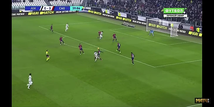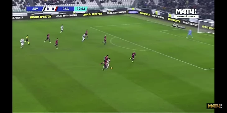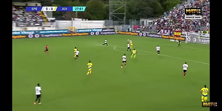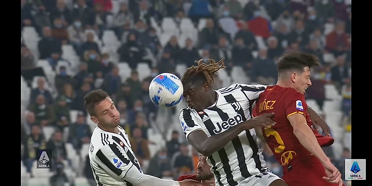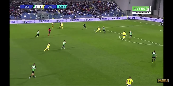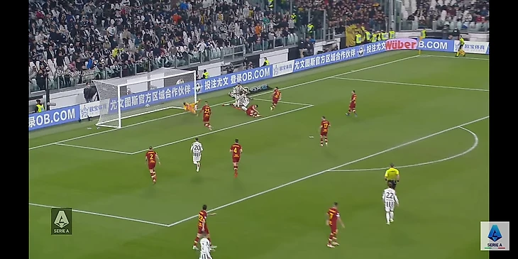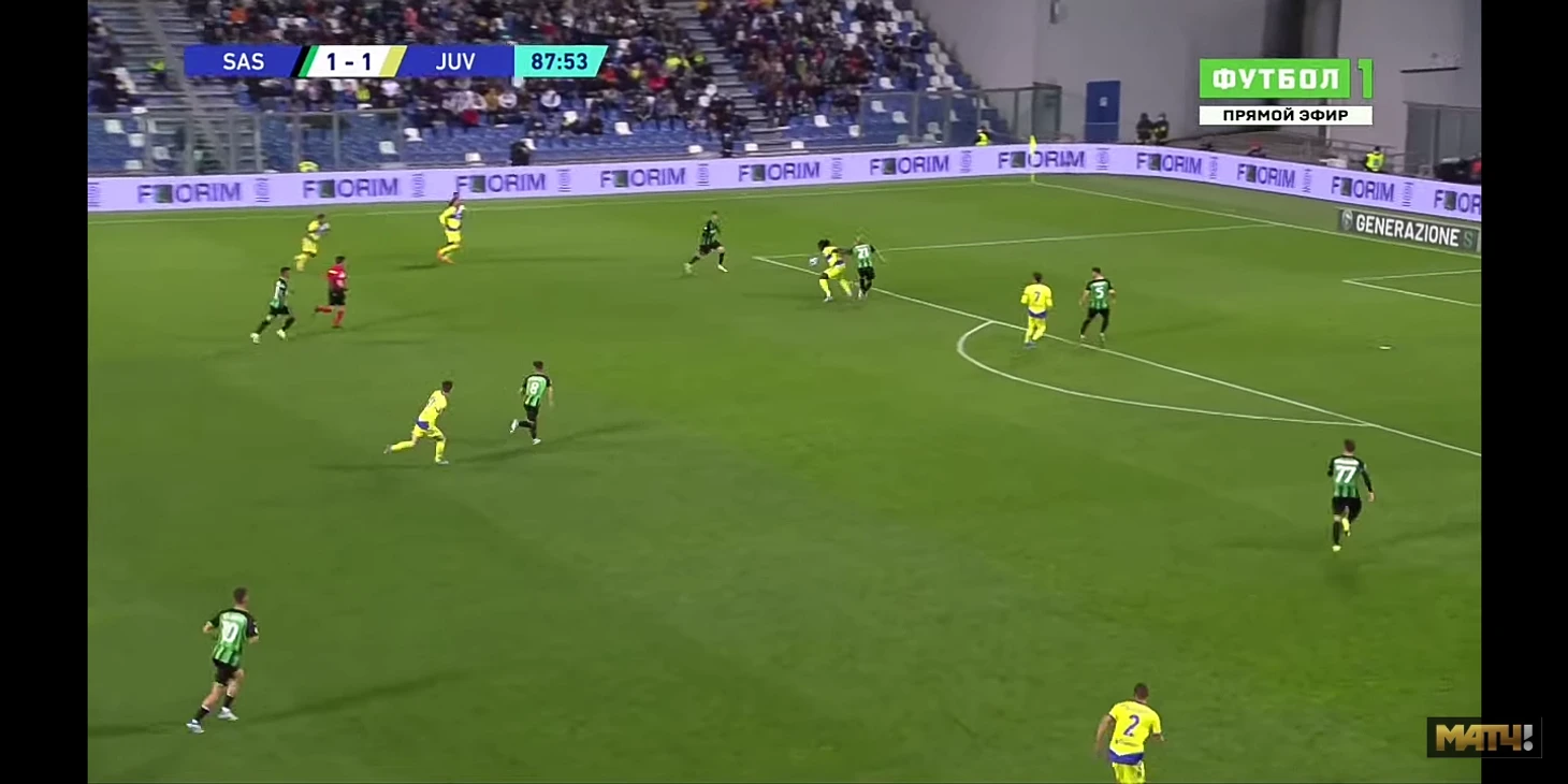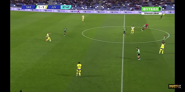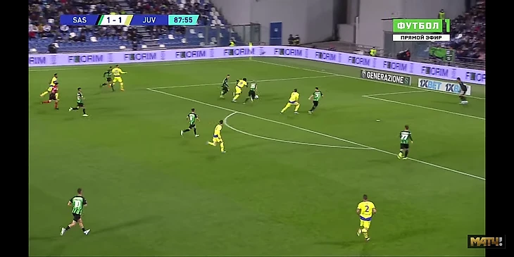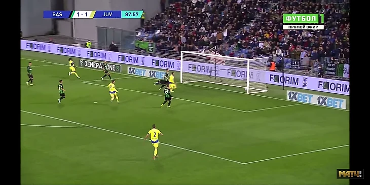 Футболист Ювентуса совершает передачу головой. Расположившись спиной к воротам и обороне Сассуоло, Кин принимает мяч, далее бежит с ним и, будучи в штрафной забивает гол.