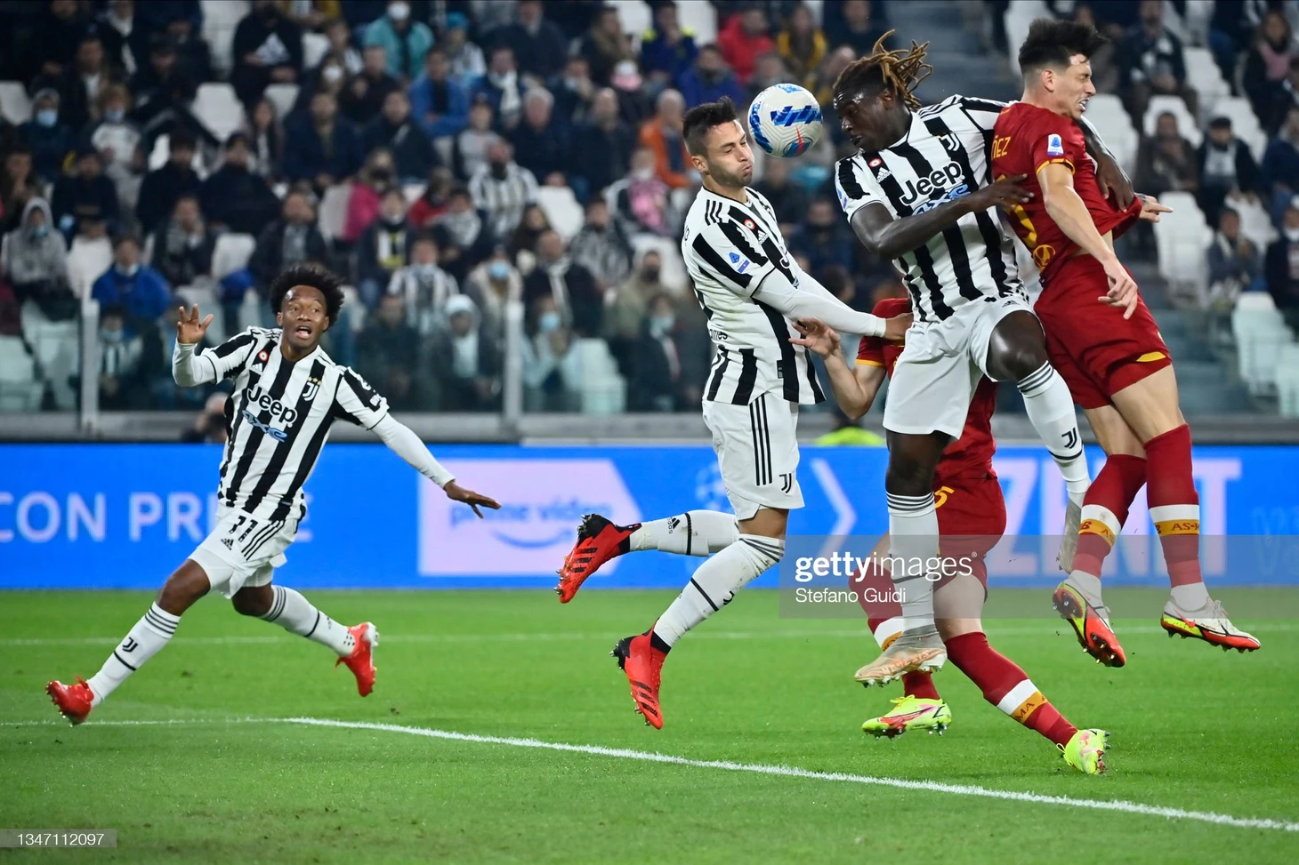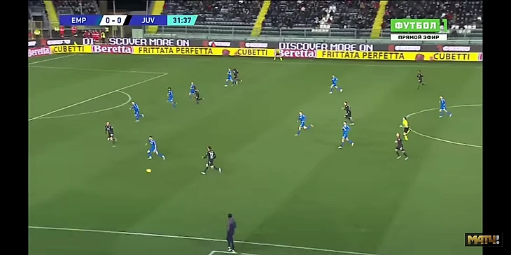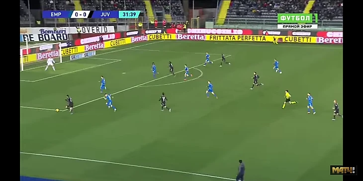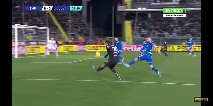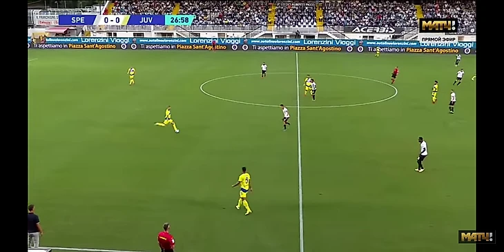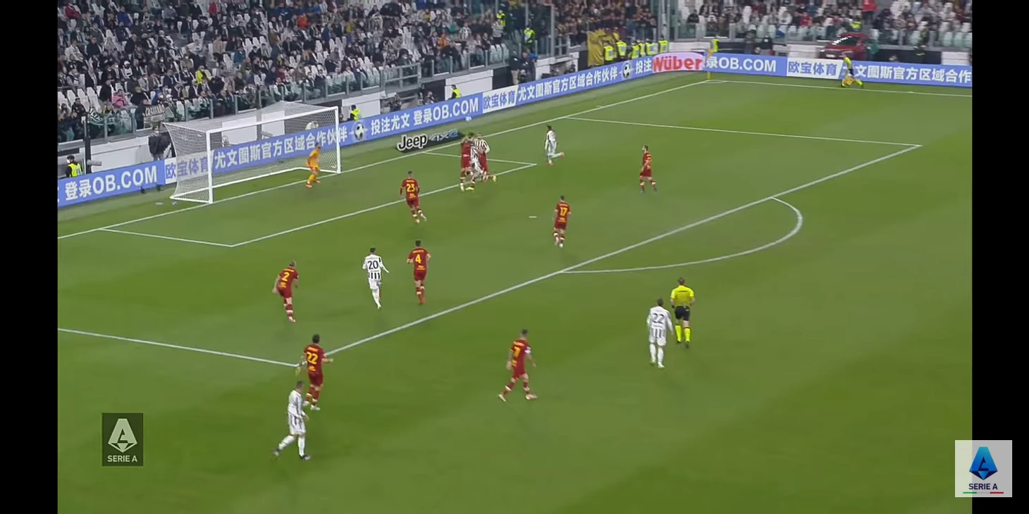 Футболист Ювентуса совершает передачу головой. Расположившись спиной к воротам и обороне Сассуоло, Кин принимает мяч, далее бежит с ним и, будучи в штрафной забивает гол.