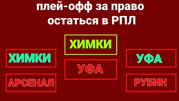 • За выживание (право остаться в РПЛ). Со следующего сезона вылетает не 4 команды, а 3, но при этом отменяются стыковые матчи, то есть 3 клуба точно покидают лигу. Команда, которая выиграет этот плей-офф гарантировано остаётся. Жеребьёвки нет, в первом этапе лучший играет с худшим - 13-16, 14-15.