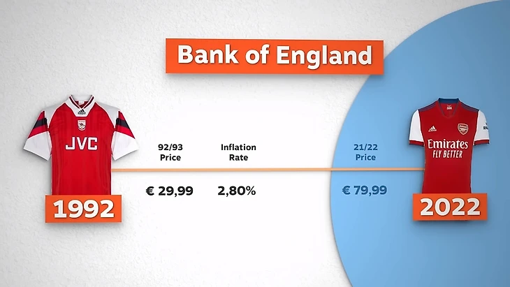 По данным Банка Англии, средний показатель инфляции с 1992 года составил 2,8 %. Если учесть это, 30 евро тогда были бы около 70 евро в сегодняшних деньгах. И это в значительной степени выражает то, что Вы платите за реплику футбольной формы сегодня. Это не значит, что цена в 70 евро за футбольную форму — это дешево, но это также не означает, что Мы упустили лучшее время для её покупки — обычная футбольная форма всегда была дорога.