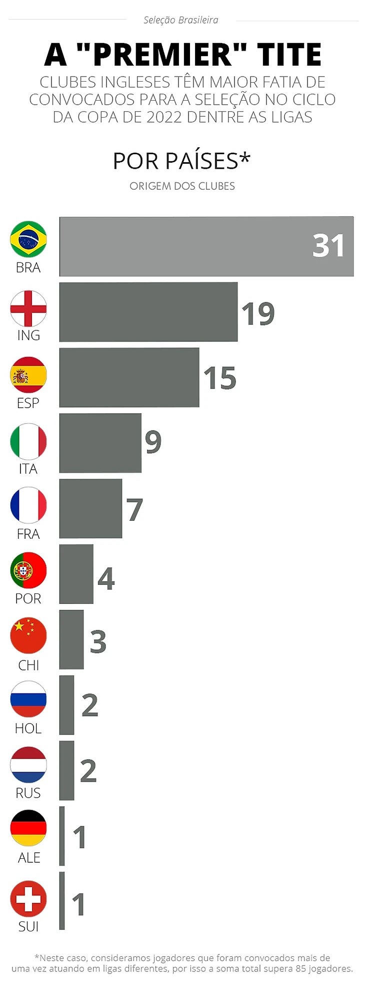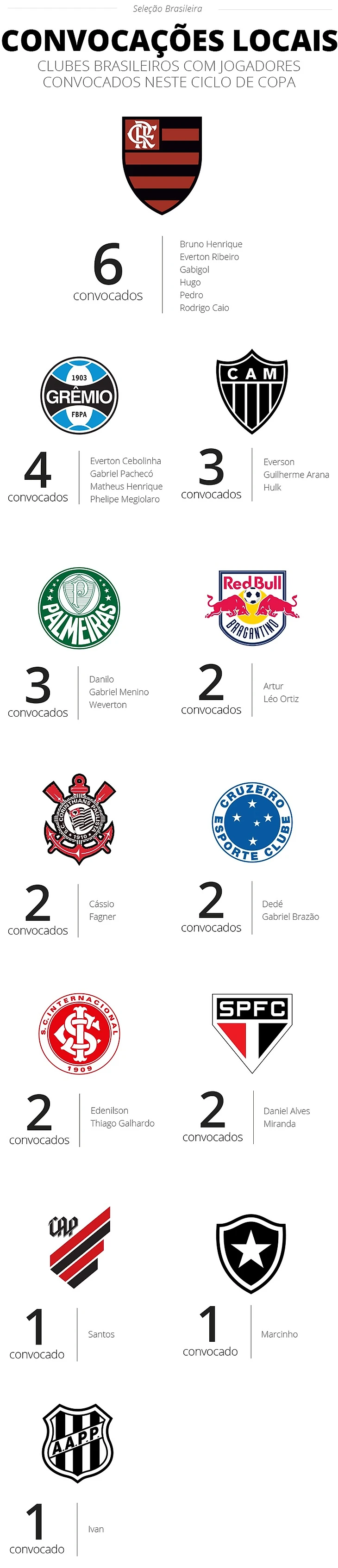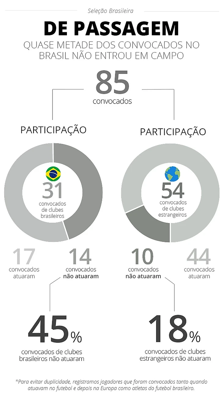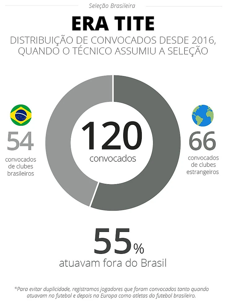 120 вызванных за 6 лет игроков, из них 54 из Бразилии. Однако дальнейший анализ данных показывает очевидное превосходство «легионеров». Помимо того, что они составляют большинство, они больше используются. В этом цикле ЧМ почти половина вызванных игроков из бразильских клубов даже не вышла на поле. В отношении футболистов, играющих за границей, этот процент составляет 18% .