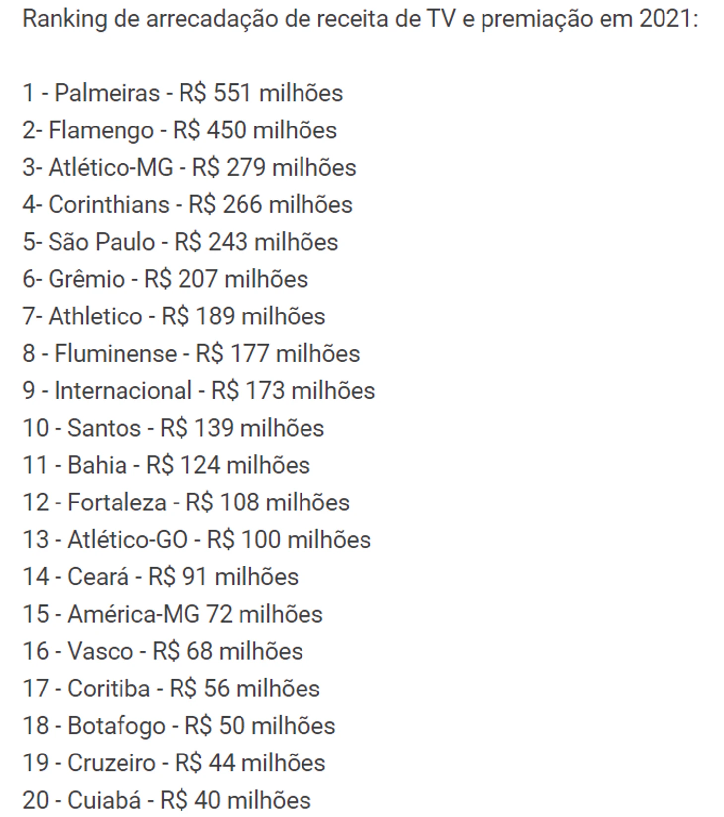 1. В таблице про деньги 2021 года я так понимаю все заработки с ТВ, включая ЛА, кубок Бразилии, чемпионаты штатов и другие турниры. Иначе не просто так Палмейрас на 1 месте.