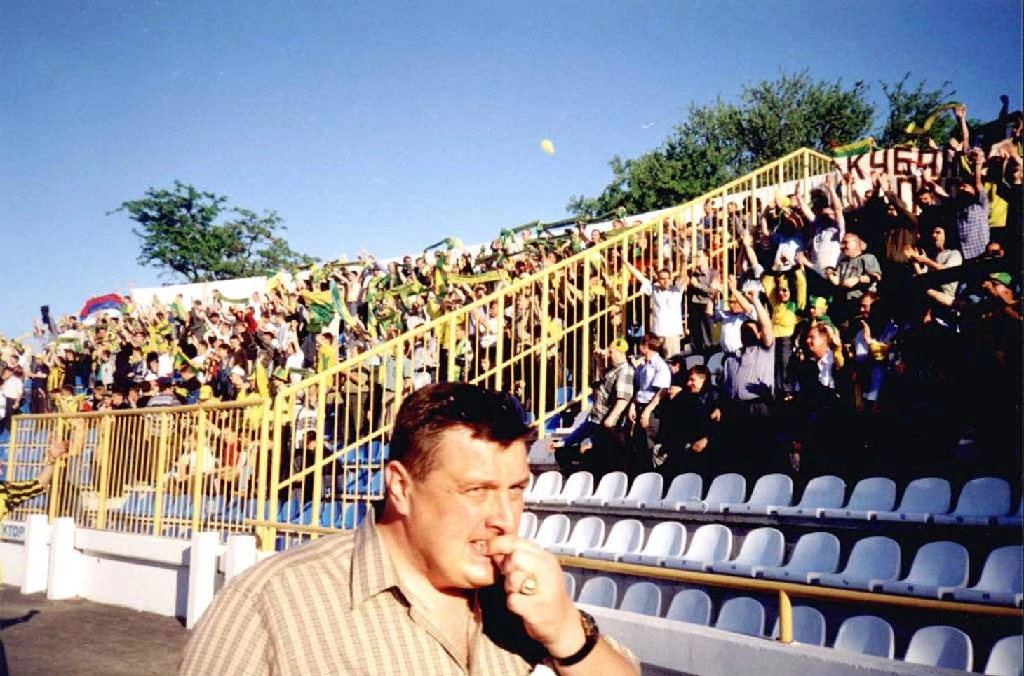 Ну а это самый древний выезд, который мы нашли. Между Кубанью и Черноморцем с начала нулевых, а то и раньше, было достаточно жесткое противостояние, и выезд в 2002 году стал его пиковой точкой. 2000 кубанских фанатов приехали в Новороссийск, увидели поражение своей команды 0:2, перед и после игры происходили несколько столкновений, автобус Кубани разбили камнями и чем-то ещё, а Черноморец в итоге вышел в последний раз в своей истории в премьер-лигу.
