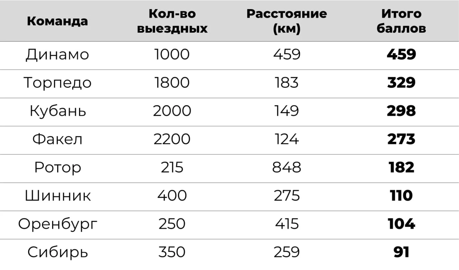Отдавая себе полный отчёт в том, что от Томска до Новосибирска ехать значительно дольше, чем от Воронежа до Липецка, мы решили сделать дополнительно таблицу данных выездов с учётом расстояния между стадионами. Количество фанатов умножается на расстояние между городами по трассе и делится на 1000 для создания коэффициента с последующим округлением. По такой формуле работала небезызвестная Ультрас-Лига на сайте Onedivision. Чем выше коэффициент, тем круче данный выезд.
