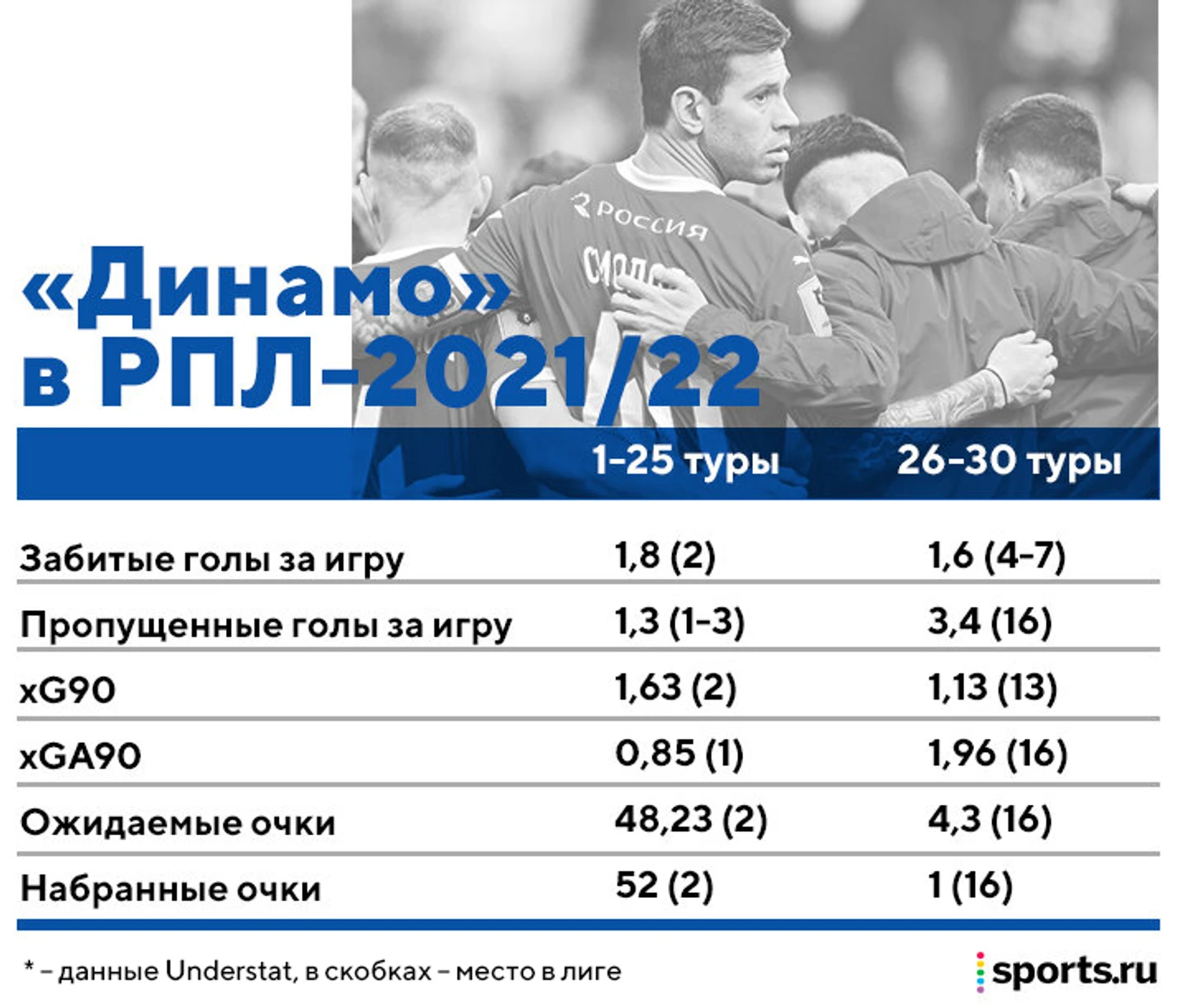 С конца апреля «Динамо» – худшая команда РПЛ по пропущенным голам, ожидаемым и набранным очкам (даже у «Арсенала больше – 2), допущенному xG.Также – двенадцатая по созданному xG и седьмая по реальным голам.