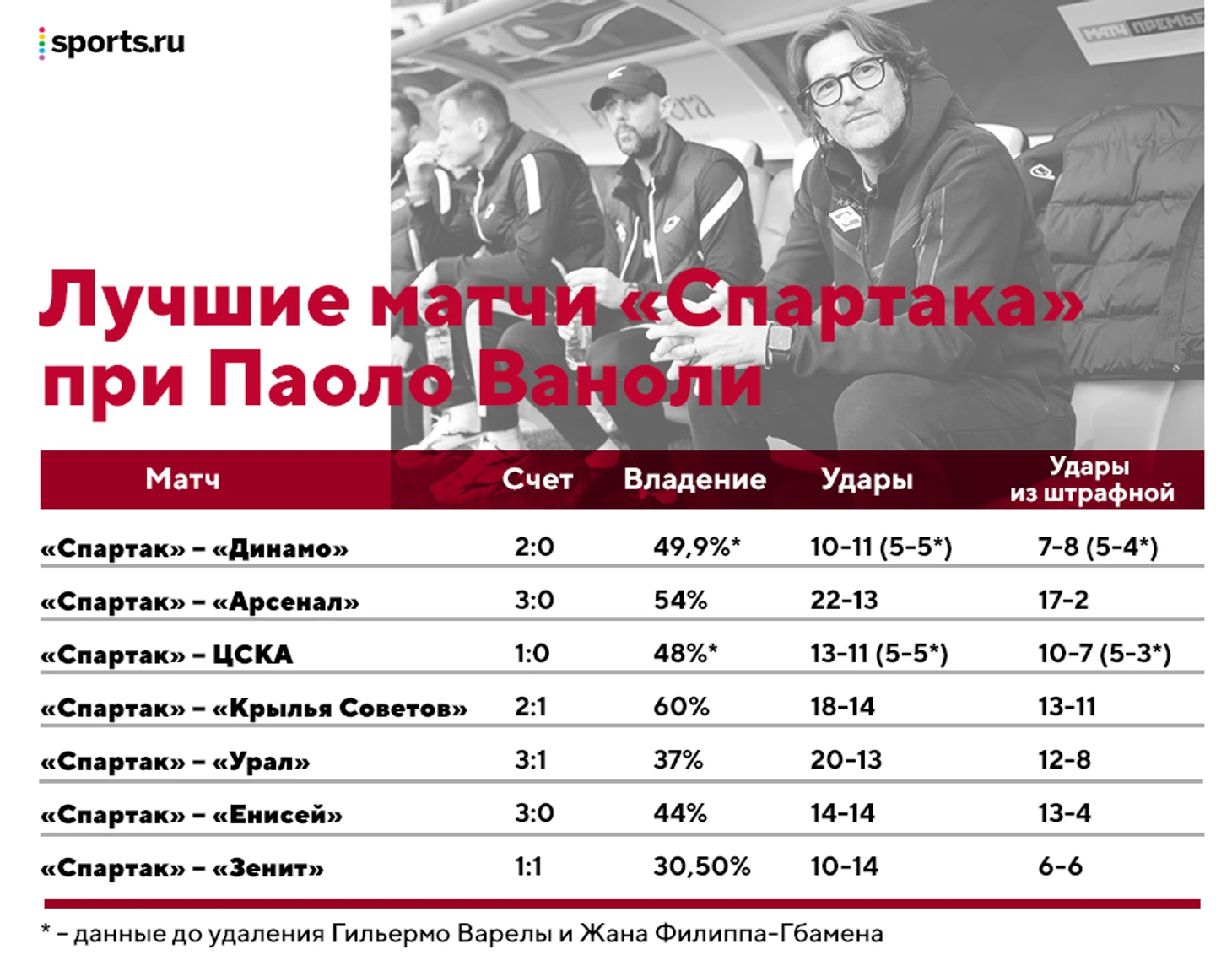 Сначала «Спартак» оказался слабее ЦСКА (0:2), но затем грамотно разобрал «Динамо» (2:0) и перекрыл позиционные атаки «Зенита» (1:1). Плюс Ваноли подготовился в Кубке России: закрыл звезд ЦСКА (1:0) и использовал высокую линию обороны «Енисея» (3:0).