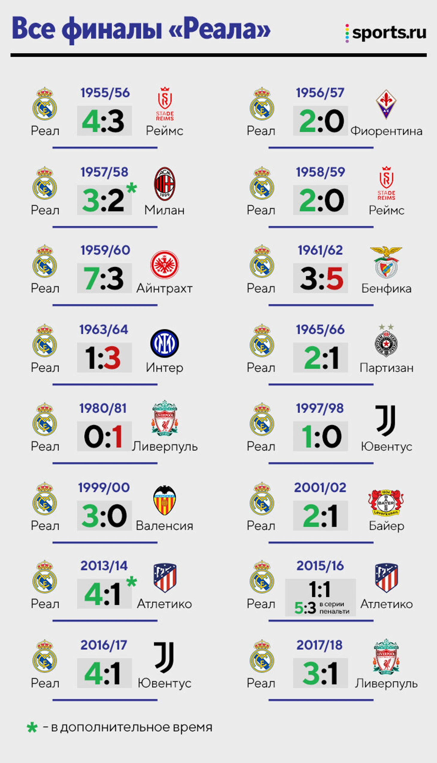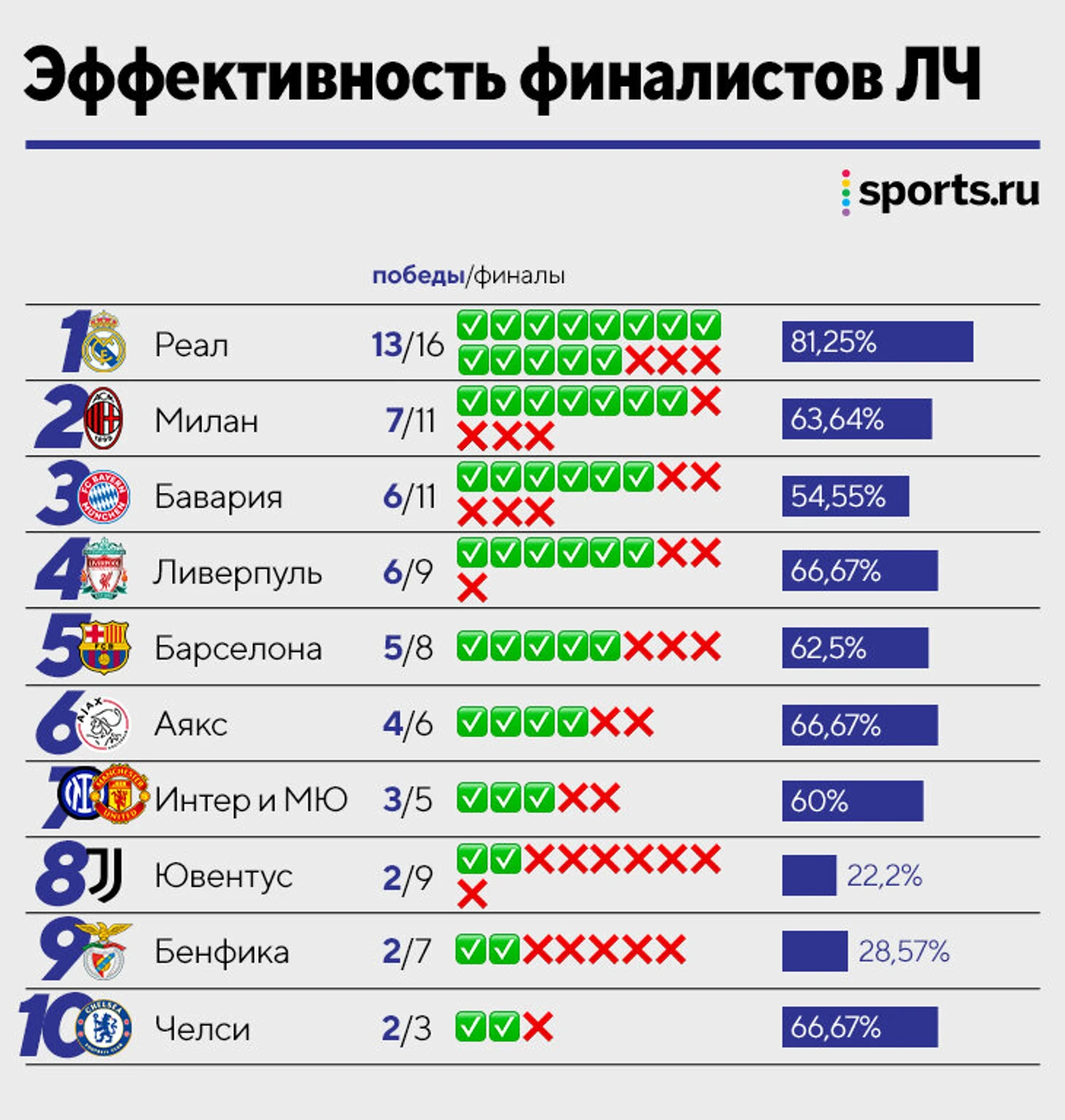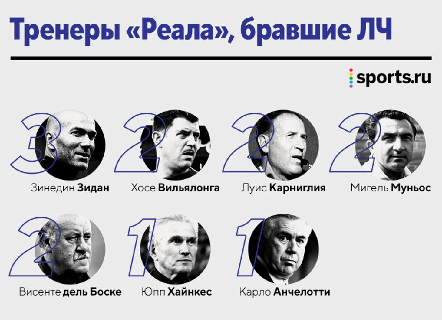Инфографика по финалистам ЛЧ: у «Реала» 13 побед в 16 финалах, у «Ливерпуля» тоже был тренер с 3 победами