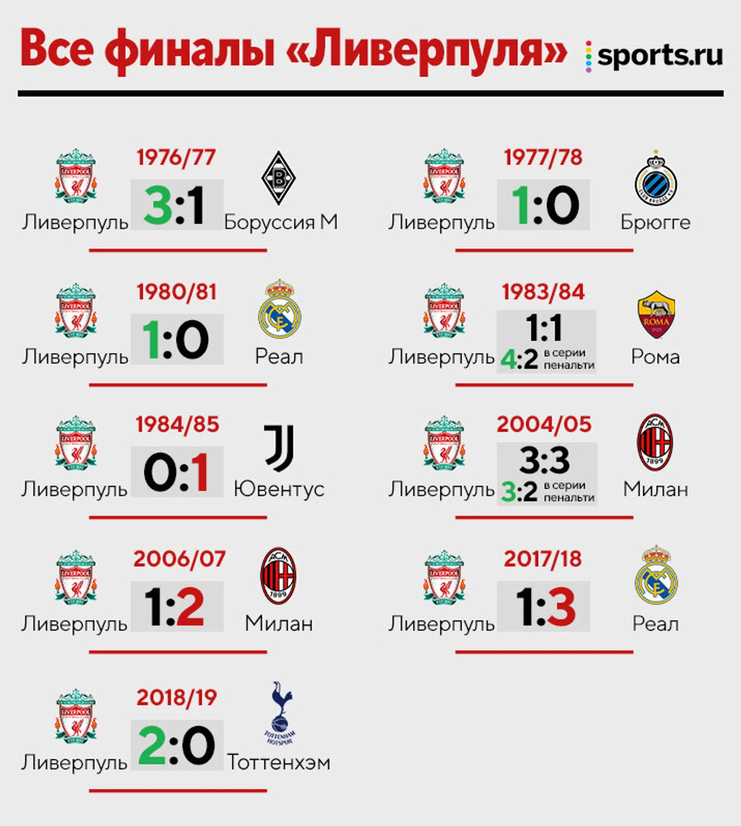 Мощнейшие результаты «Ливерпуля» – на стыке 1970-х и 1980-х, сразу пять финалов и четыре триумфа. В XXI веке равенство: две победы, два поражения.