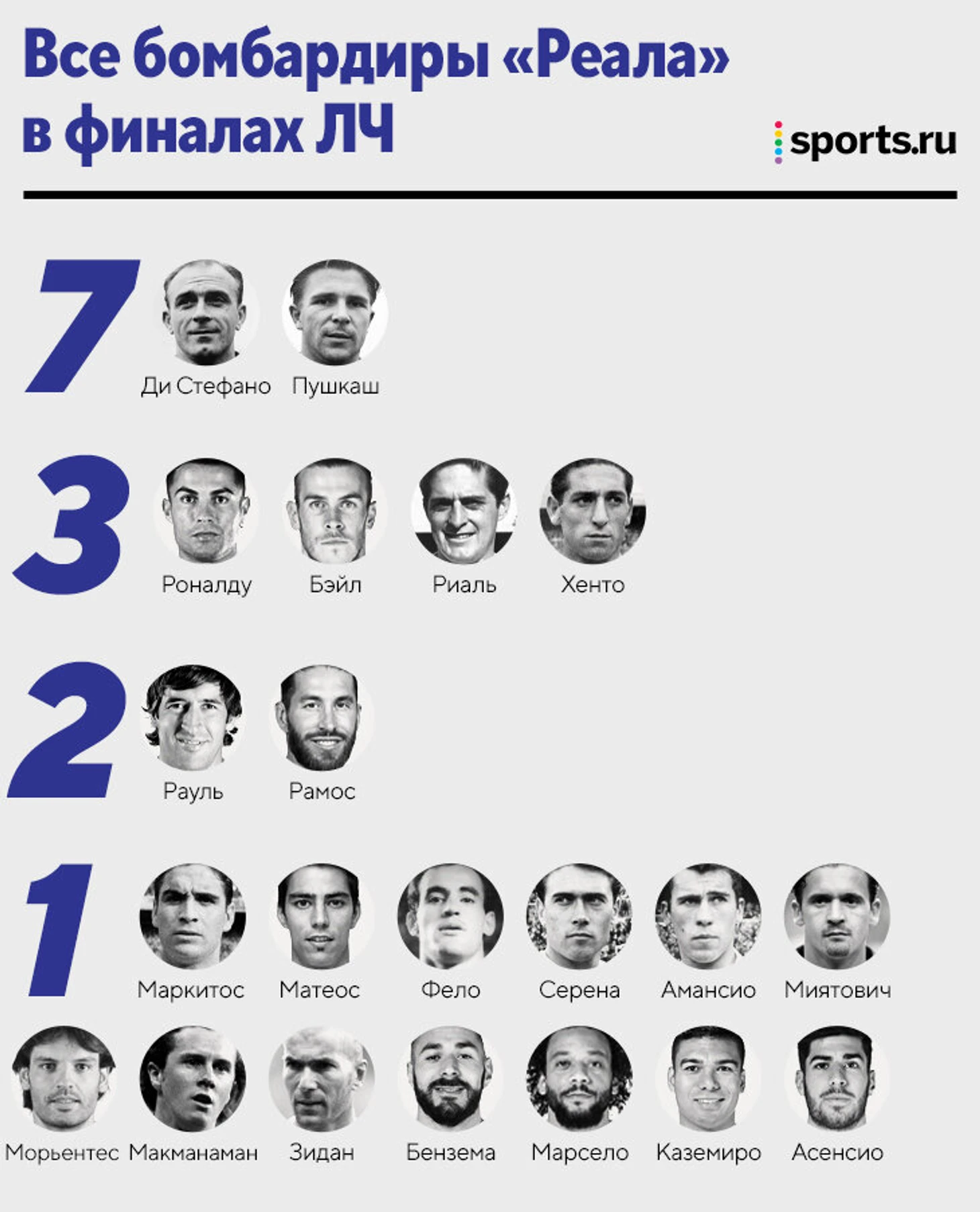 Легендарные личности: Альфредо Ди Стефано и Ференц Пушкаш наколотили в финалах по семь мячей. Дальше уже разрыв: по три у Роналду, Бэйла (еще в клубе), Риаля и Хенто. Кроме Гарета, из действующих игроков «Реала» забивали Бензема, Марсело, Каземиро и Асенсио.