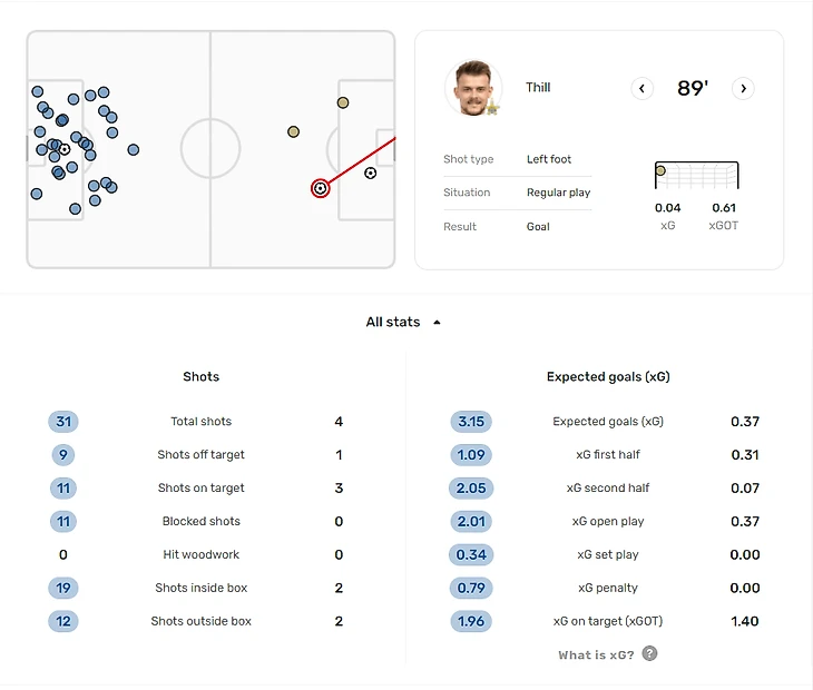Просто взгляните на статистику, чтобы понять всё величие победы тираспольского клуба на «Сантьягу Бернабеу». Что примечательно, благодаря качеству исполнителей «Шериф» конвертировал 0.37 в 1.4 xGOT (опасность ударов непосредственно для Курта). Обычно «Реал» вытягивал матчи благодаря индивидуальному классу игроков. но коллектив Вернидуба оказался сильнее.