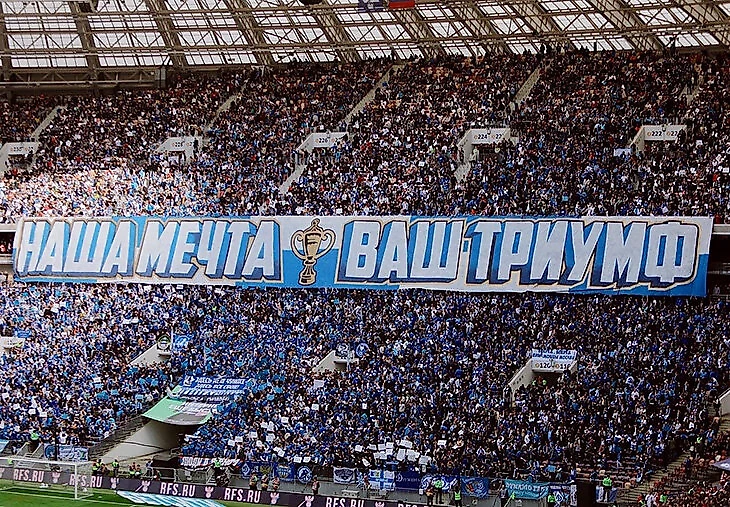 А вот у «Динамо» – наоборот. Меньшее представительство на трибунах, но с большим баннером.