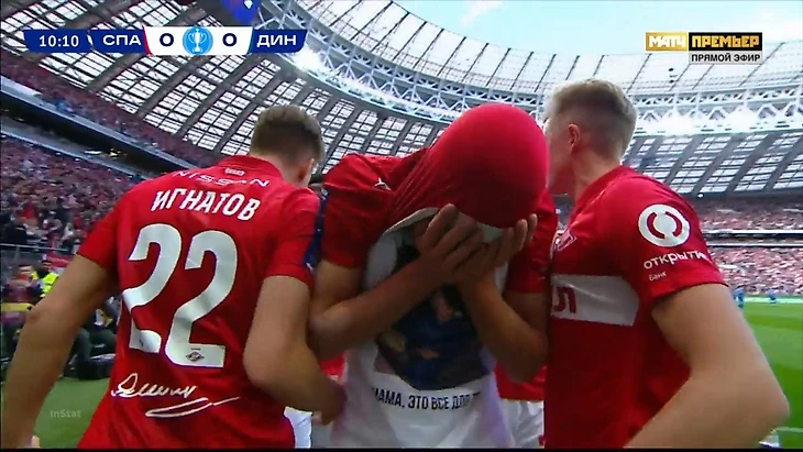 Пока судьи разбирались, Соболев праздновал: спрятал лицо в игровую футболку и показал майку с фотографией мамы и подписью: «Мама, это все для тебя!»