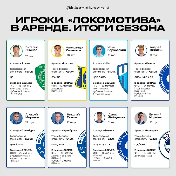 Восемь футболистов «Локомотива» пробовали себя в других клубах. Оцениваем, что получилось. Это итоговый пост постоянной рубрики Локо Подкаста «Как там наши парни в аренде».