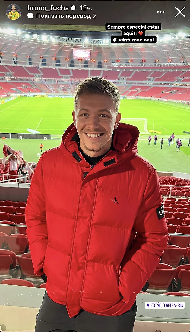 Бразильский защитник ЦСКА Бруно Фукс, редко выходящий на поле, проводит отпуск в Порту-Алегри, где посетил матч родного «Интернасьонала».