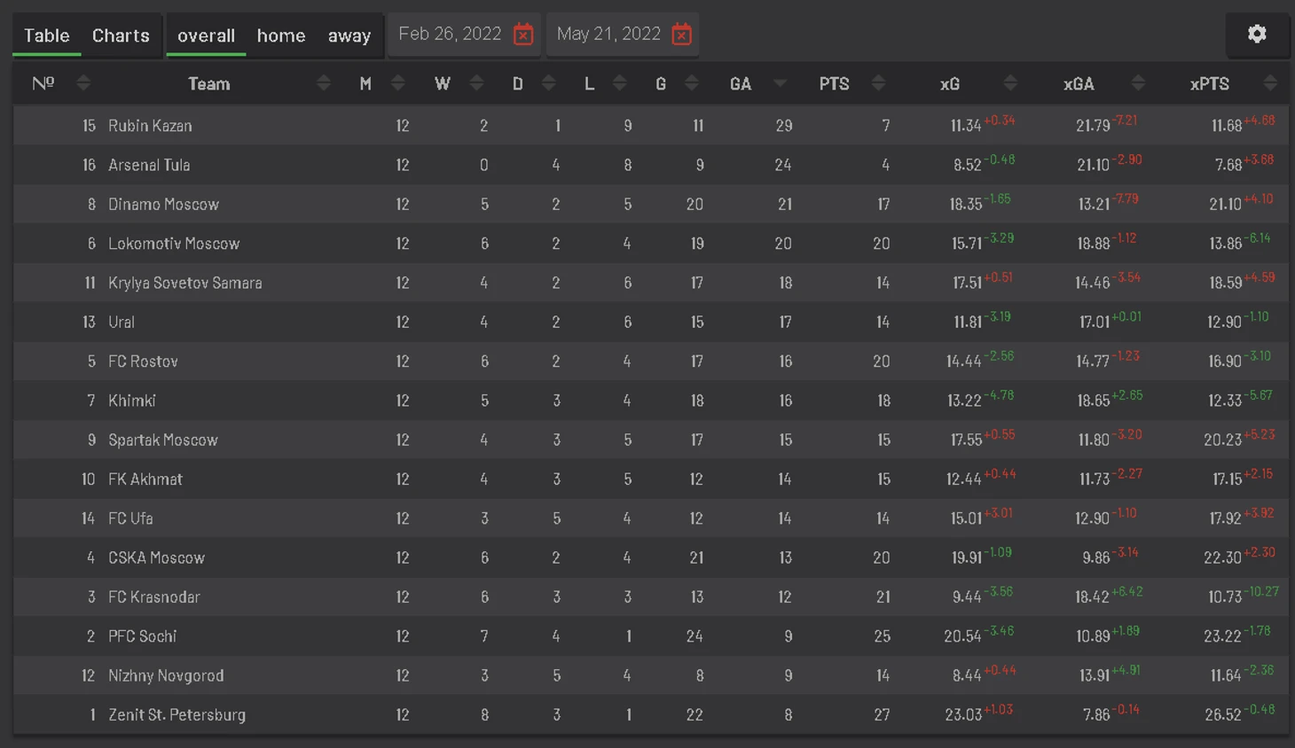До распада основной пары центрбеков, "Динамо" пропустило на один мяч больше, чем ожидалось - в целом, не так критично, "привозов" обороны, как таковых, не случалось, валидол не требовался. Теперь же переходим к 26-му февраля - дата отъезда Ордеца и первое появление Евгеньева в основном составе. Команда побеждает 3-0, но Роман зарабатывает удаление и умудряется получить самую низкую оценку на поле (среди игроков "Динамо") - 5.4. Вернемся к цифрам, которые показывают аномальные значения: 21 пропущенный мяч за 12 игр (берем в расчет период с 26 февраля по 21 мая) - хуже только у мёртвого "Арсенала" и "Рубина". Но команда должна была пропустить на 8 мячей меньше - ни у одной из команд нет такой пугающей статистики.