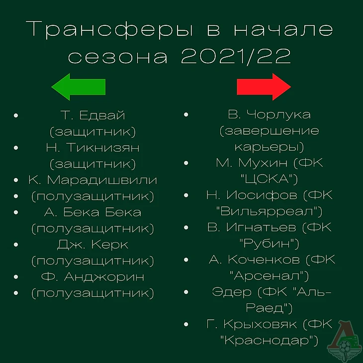 Сразу в конце сезона 2020/21 было объявлено о завершении карьеры многолетнего капитана В. Чорлуки. Также клуб покинули М. Мухин, В. Игнатьев, Н. Иосифов, А. Коченков и Эдер. В конце июля в состав «железнодорожников» вошел полузащитник Т. Едвай. Г. Крыховяк перешёл в ФК «Краснодар». В самом начале августа команде присоединились такие игроки как Н. Тикнизян, К. Марадишвили, А. Бека Бека, Дж. Керк и Ф. Анджорин.
