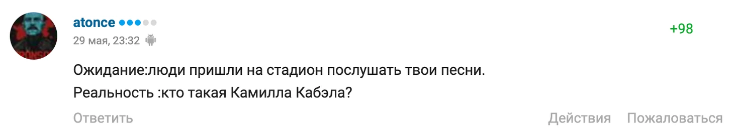 Не в восторге и сама Камила: «Поверить не могу, что люди так громко пели гимны команд во время нашего шоу. Мы так долго и усердно работали, чтобы все сделать классно и хорошо выступить», – написала певица в твиттере. Потом она все же удалила твит, вероятно, чтобы не напороться на еще больший негатив.