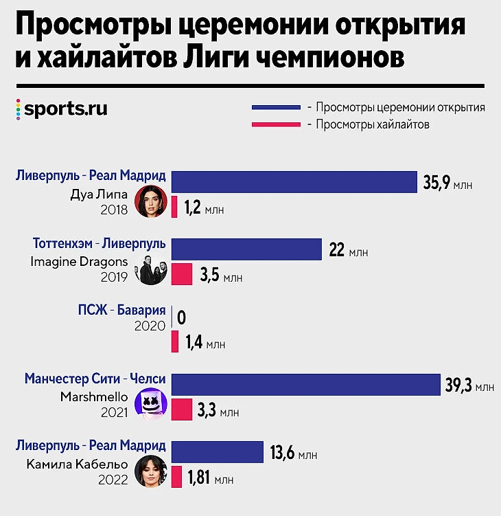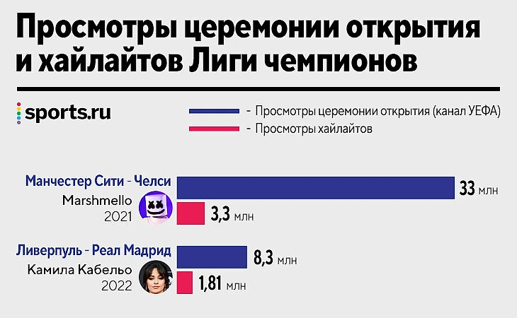 Церемонии открытия с участием суперзвезд начали проводить недавно. В 2017-м в Кардиффе выступили Black Eyed Peas, затем финалы (с перерывом на ковидный 2020-й) открывали артисты из топа стримингов: Дуа Липа (2018), Imagine Dragons (2019), Marshmello (2021) с предзаписанным выступлением и, наконец, Камила Кабельо.