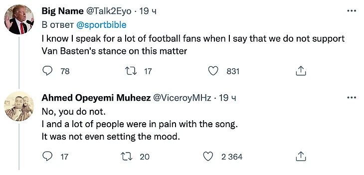 Комментатор Георгий Черданцев сказал, что вообще не в курсе, кто выступает на открытии финала, а Марко ван Бастен разнес УЕФА и ФИФА: «Мы хотим посмотреть футбол, но вынуждены смотреть, как кто-то поет с танцорами. УЕФА и ФИФА пытаются заработать на футбольном матче. Держите это от нас подальше – мы хотим посмотреть матч». В комментариях под этой цитатой в твиттере мнения разделились, но большинство поддержало Ван Бастена.