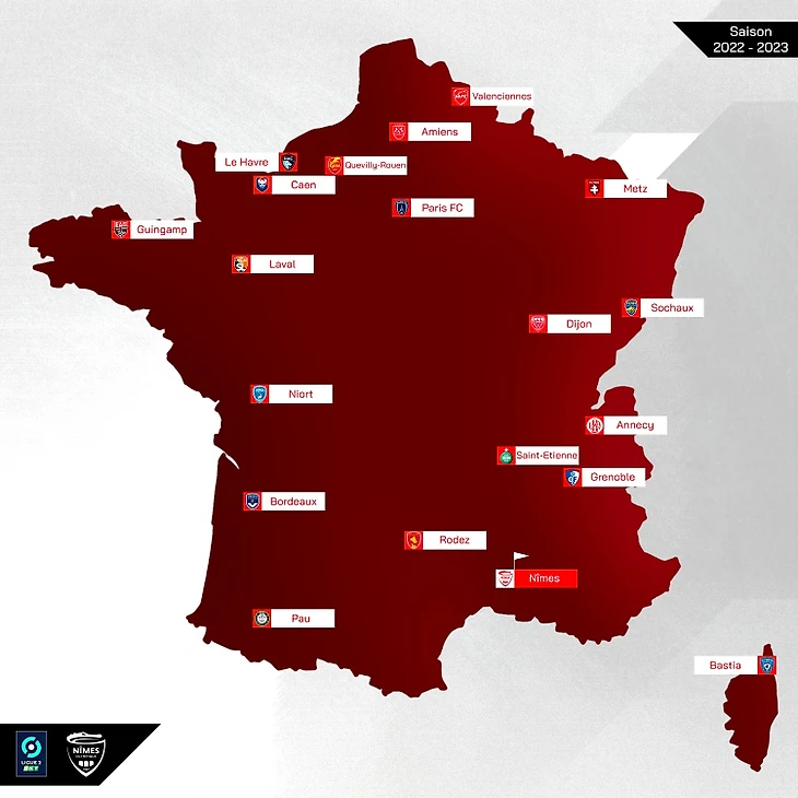 Карта Лиги 1 на сезон-2022/23 от пресс-службы "Страсбура". Юго-запад осиротел. "Тулуза" вернулась в элиту, а "Бордо" её покинул, поэтому дерби Гаронны не будет (и дерби Атлантики тоже), как и главного дерби страны - "Лиона" против "Сент-Этьена".