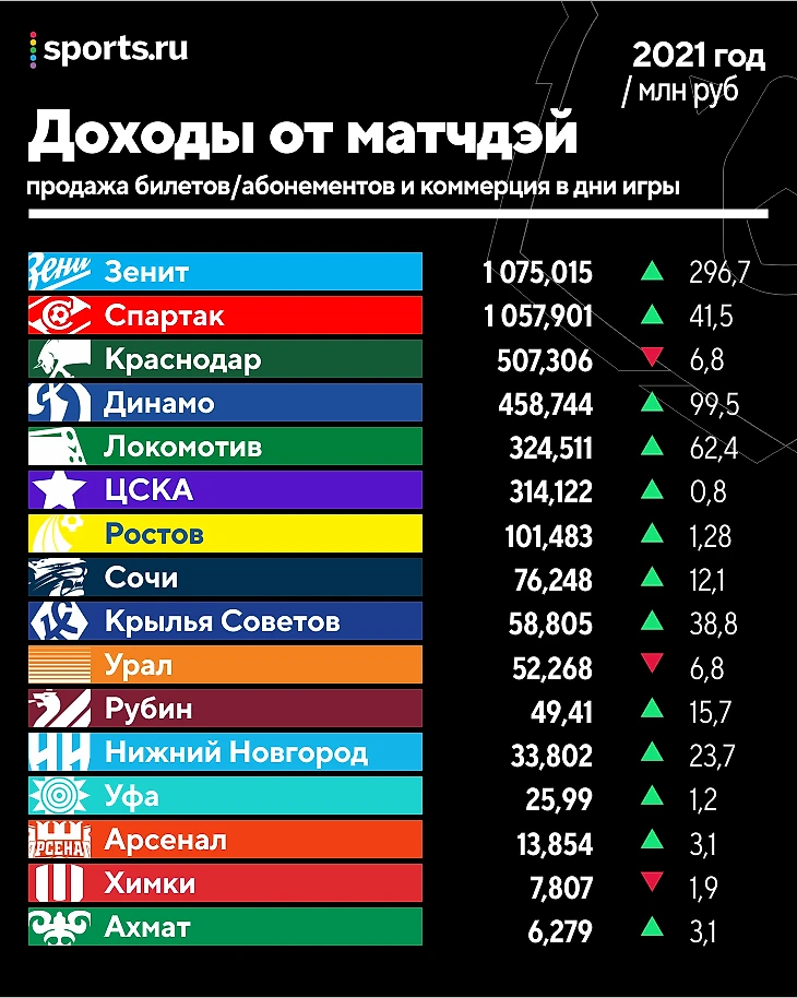 Вообще, динамику роста/падения матчдэй-доходов очень сложно оценивать на фоне пандемии. В каждом регионе были разные ограничения, которые вводились в разное время. Сравнивать доходы тут не очень корректно. К сожалению, в 2022-м у клубов появились новые проблемы, но это тема для разговора в следующем году.