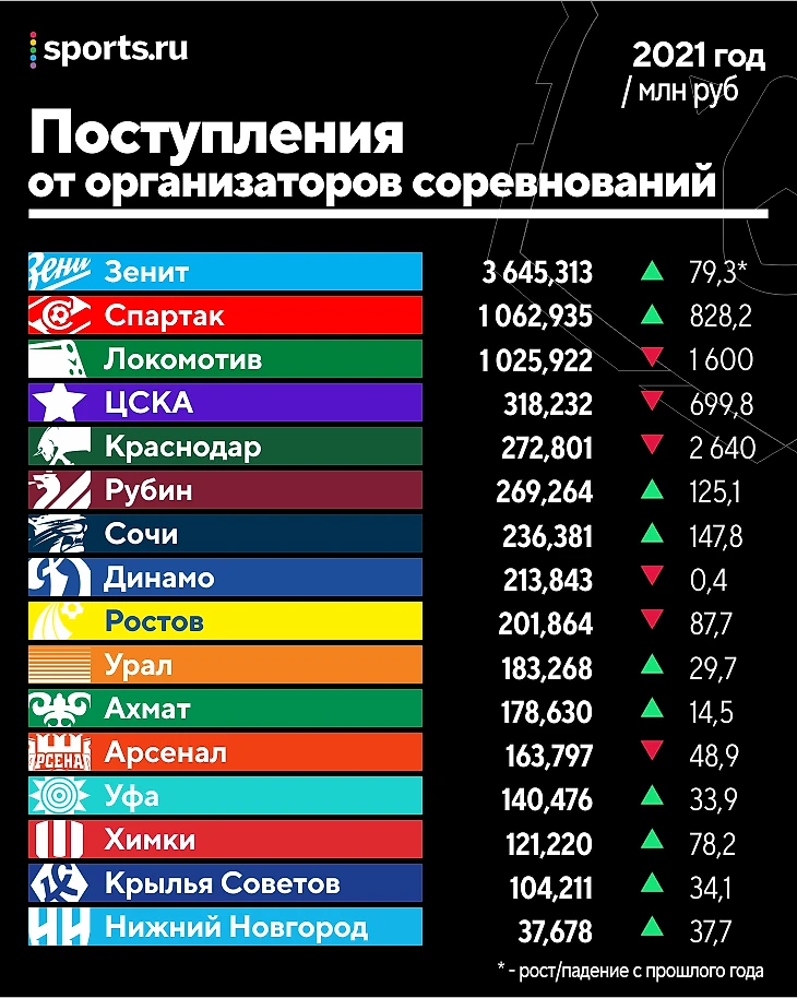 • «Сочи» только пять процентов доходов получает из данной статьи, «Спартак» – шесть «Зенит» – три, «Локомотив» – два, «Краснодар» (похоже, это прямые инвестиции Сергея Галицкого) – почти половину.