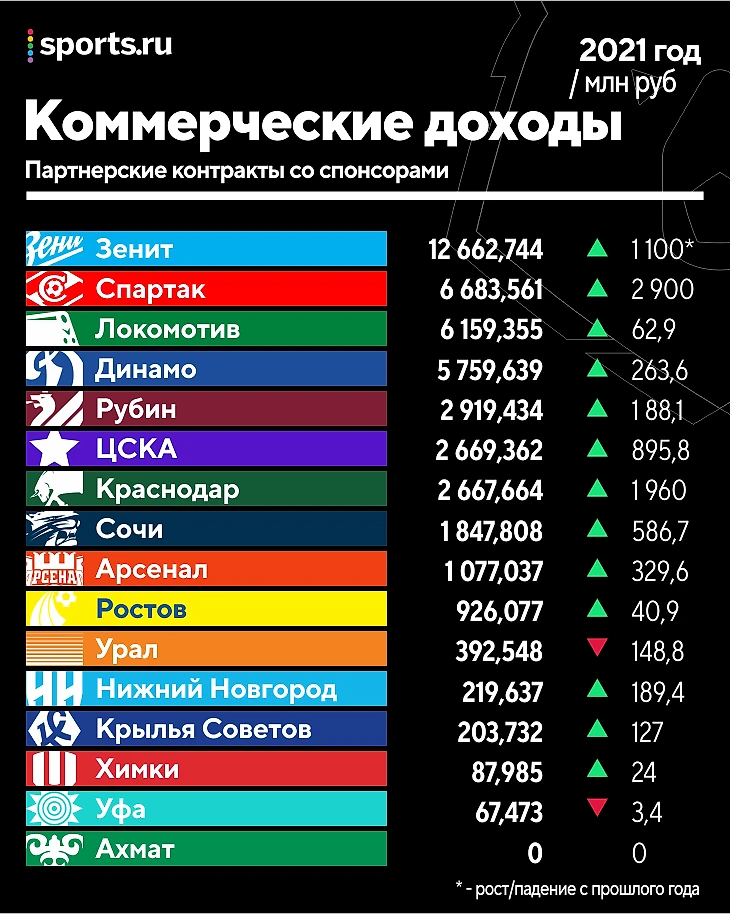 • Коммерческие доходы одного «Зенита» (спонсоры – «Газпром» и его дочерние компании, «Сибур», G-Drive, G-Energy, «Согаз», «Газпромбанк» и австрийская нефтегазовая компания OMV) больше суммы таких доходов одиннадцати клубов РПЛ (от ЦСКА и ниже по рейтингу).