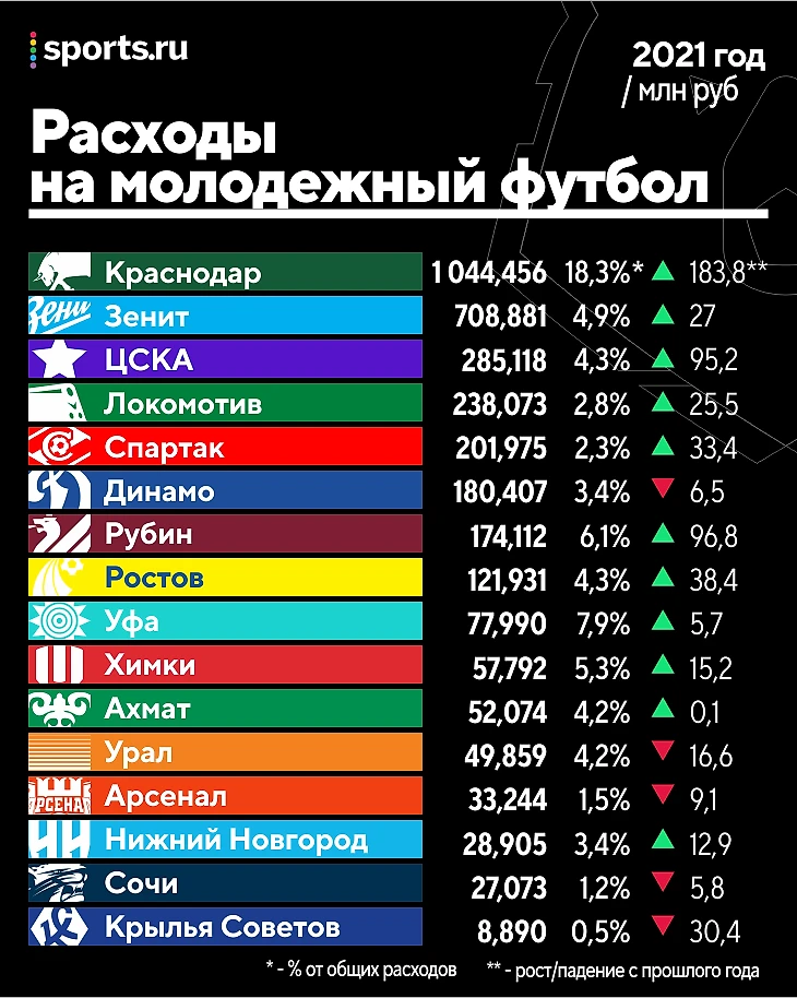 • «Краснодар», который и так был безоговорочным лидером расходов на молодежь, увеличил их на самую большую сумму – на почти двести миллионов рублей.