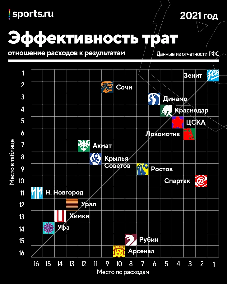 Диагональ – средняя эффективность. Клубы, которые размещаются на этой линии, дают результат, сопоставимый с их местом в рейтинге расходов. Те, кто выше – перевыполняют норму, то есть в таблице РПЛ взлетают выше, чем в таблице бюджетов. Те, кто ниже – наоборот.