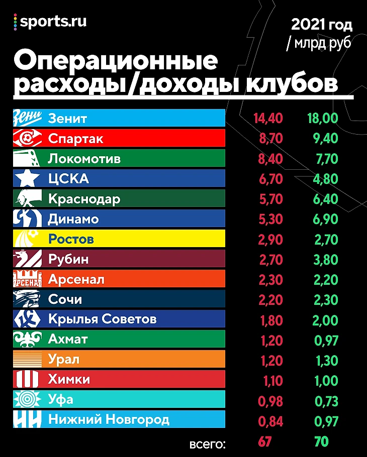 • Среди лидеров выделяется уже «Зенит» – разница в пять с половиной миллиардов от «Спартака» в расходах и восемь с половиной в доходах.
