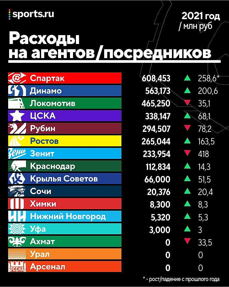 • У десяти клубов из шестнадцати выросли агентские выплаты. У «Крыльев Советов» в шесть раз.