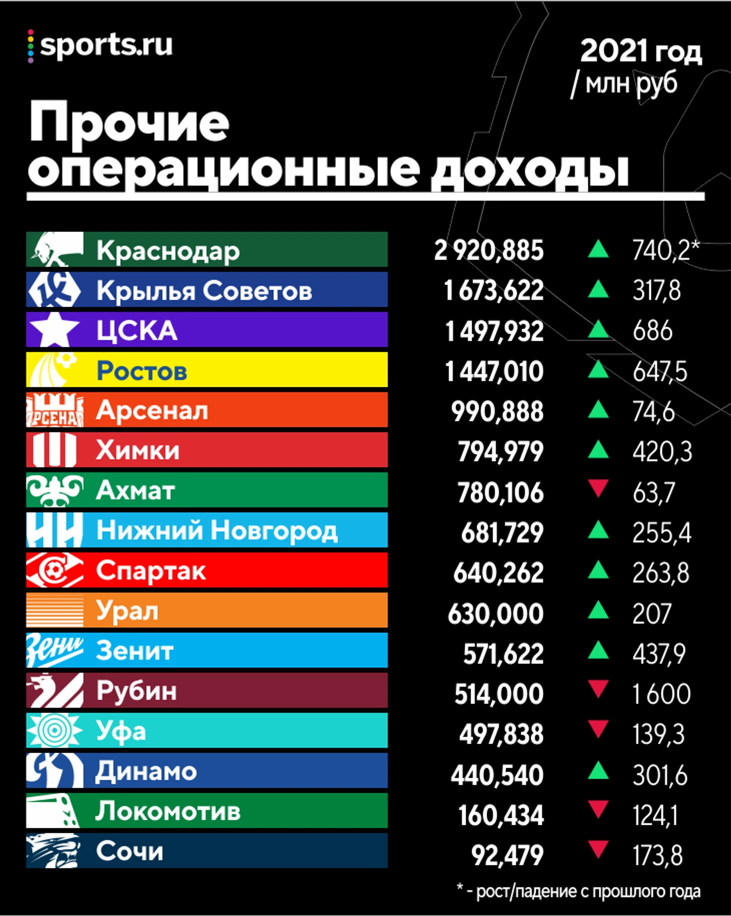 • У «Крыльев Советов», «Нижнего», «Ахмата» и «Химок» в данной строке содержится около 3/4 всех операционных доходов, у «Арсенала» и «Ростова» – половина.