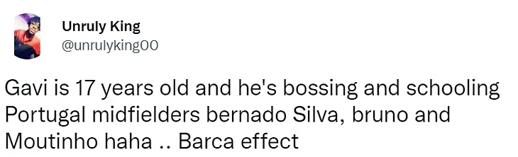 Кстати, выдающееся выступление Гави прошло на фоне слухов о том, что его партнер по «Барселоне» Жерар Пике переспал с его мамой. Вряд ли это правда, но и вряд ли слухи прошли мимо Гави – и даже это его не остановило.