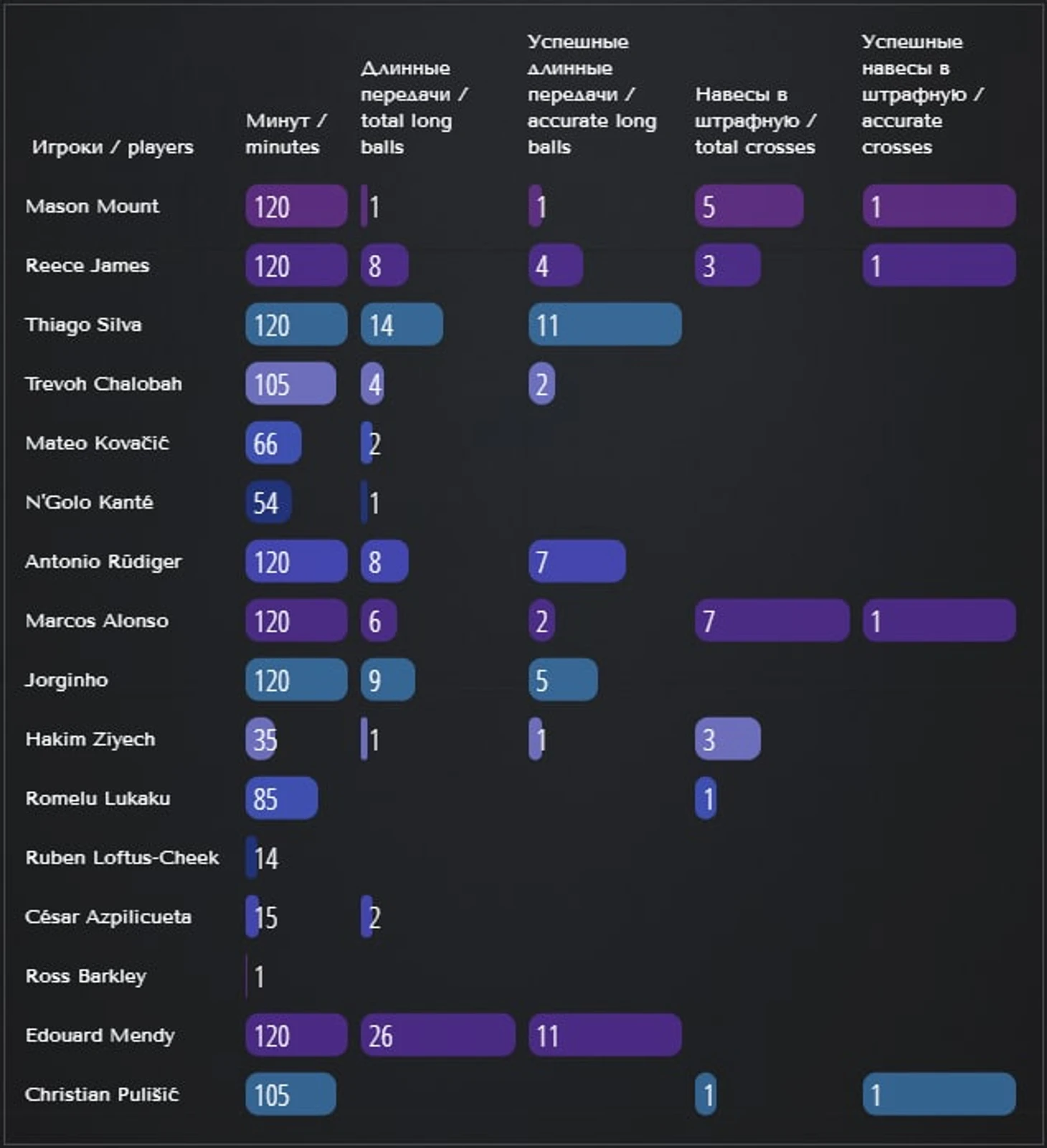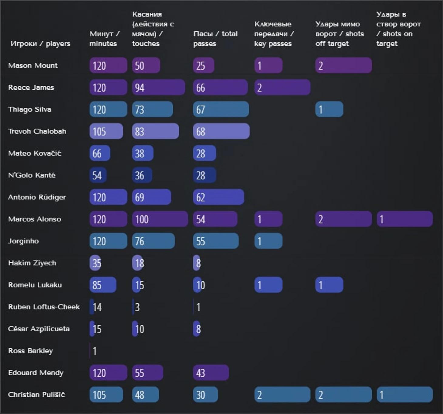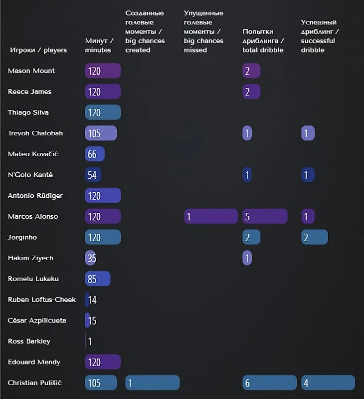 🔹Активность Пулишича в финале позитивно поражала — он раз за разом находил моменты для нанесения ударов и создавал угрозу чужим воротам: на его счету два паса под удар и единственный за матч созданный big chance. Также на фоне команды был неплох в дриблинге.