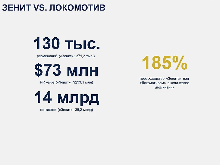 Три подряд чемпионских титула — это знак качества. Успехи последних лет не насытили нас, мы все так же голодны до титулов и стремимся брать свое в каждой игре. Мы хотим, чтобы имя «Зенита» гремело еще громче, чтобы эмоции наших болельщиков были еще ярче. Поэтому мы принимаем вызов нового сезона и ставим на максимум звук и яркость. «Громче и ярче!» — становится Петербург в дни футбольных матчей. «Громче и ярче!» — наш призыв к болельщикам в сезоне-2021/22. В итоге, медиаохват составил более 400 млн за полгода на клубных ресурсах. Стоит похвалить людей, которые принимали участие в создании и реализации этого, поскольку чего-то подобного внутри нашего футбола - ну очень мало. 2. Презентация Клаудиньо: 2 млн просмотров ролика на клубных ресурсах — самая успешная презентация в истории российских клубов с точки зрения просмотров на август 2021-го. 3. Презентация Юри Алберто под модный бразильский трек собрала 4,2 млн просмотров ролика на клубных ресурсах и стала самым успешным представлением игрока в истории российских клубов. 4. В декабре клуб организовал социальную акцию «Собакам лучше дома!», в рамках которой футболисты «Зенита» появились на поле вместе со щенками из приютов. Акция была призвана обратить внимание на проблемы ответственности за домашних животных и ухода за ними, а также призвать всех неравнодушных людей к помощи и благоустройству приютов. Охват в клубных медиа составил 10 млн просмотров, о ней написали крупнейшие мировые медиа — 433, Bleacherreport, Pubity, SPORTbible, Barstool Sports, TSN, Sportsnet, TNT Sports Brasil, Sporf, ESPN, The Indian Express, Pulse.ng, Soccer America, Marca, Olé, Globo, A Bola, Ran.de, VTV, Sabah и многие другие. 5. Клубные соцсети — самые популярные в России: 7,3 млн подписчиков в семи ключевых сетях (ВКонтакте, Твиттер, YouTube, TikTok, Facebook, Инстаграм, Телеграм), у «Спартака» — 6,1 млн. То есть за сезон совершили рывок, позволивший обойти прямого конкурента аж на 1,2 млн после периода небольшого отставания.