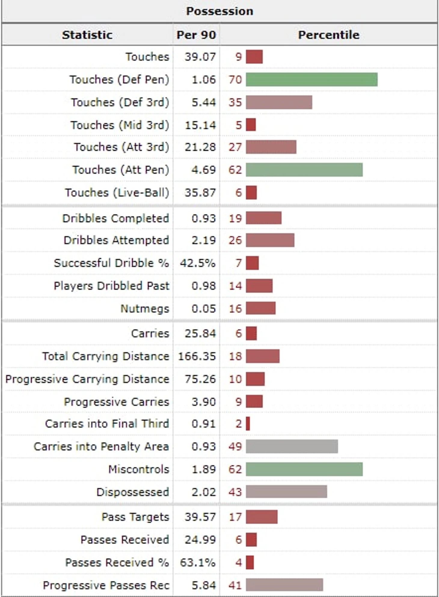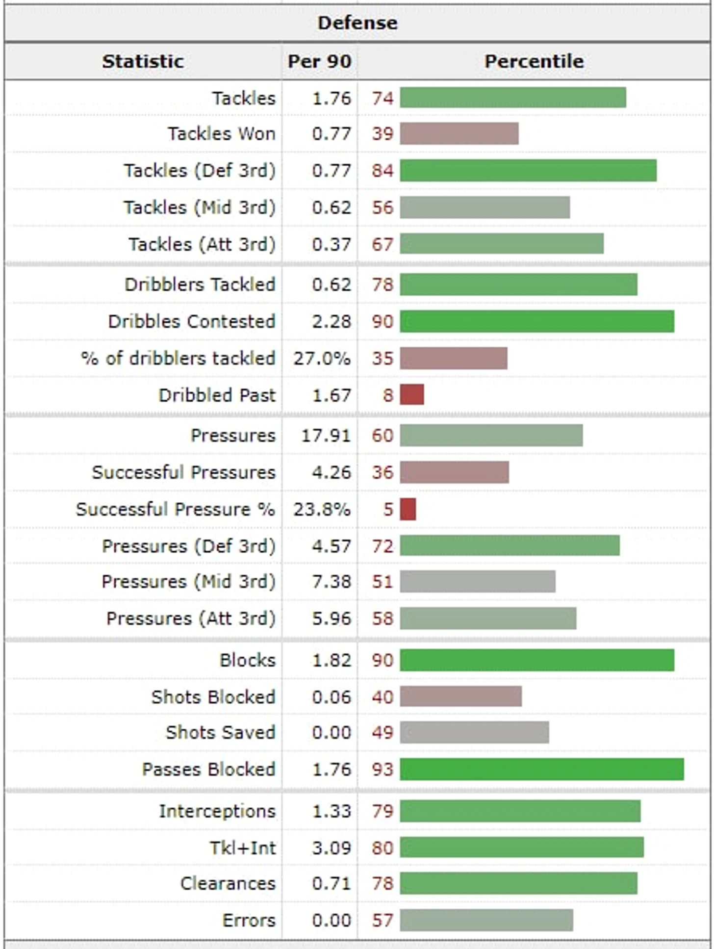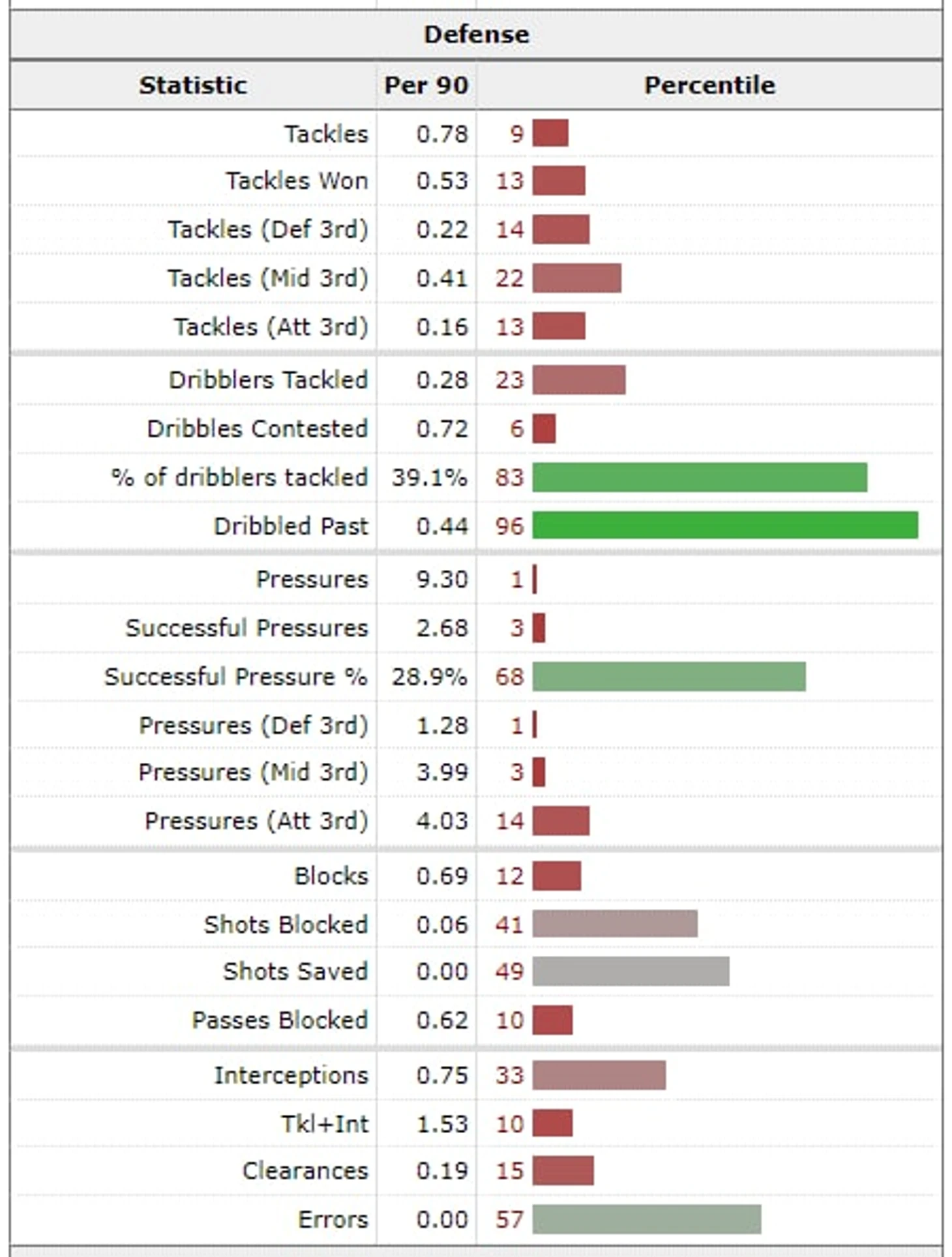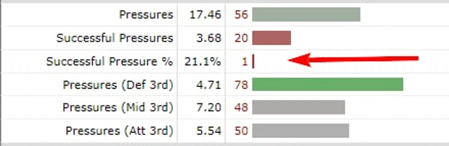 Он неплох в попытках оказать давление на соперника (pressures), но то, как он вынуждает его терять мяч при своих трудозатратах — это сущий кошмар (Successful Pressure %). Практически все игроки подобного амплуа делают это лучше англичанина.