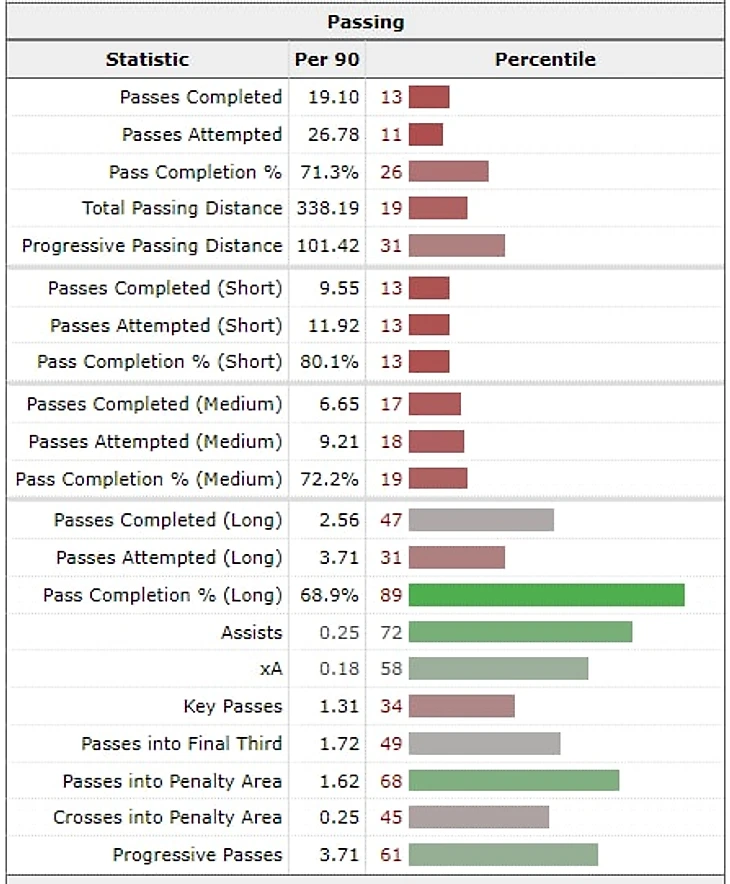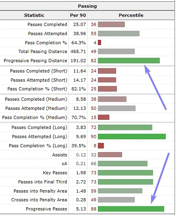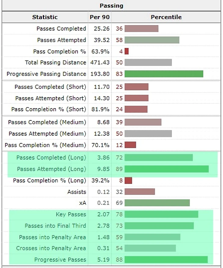 Говорит это о его любви к обострению и длинным передачам. Подтверждается это высоким количеством ключевых передач и пасов в финальную треть: