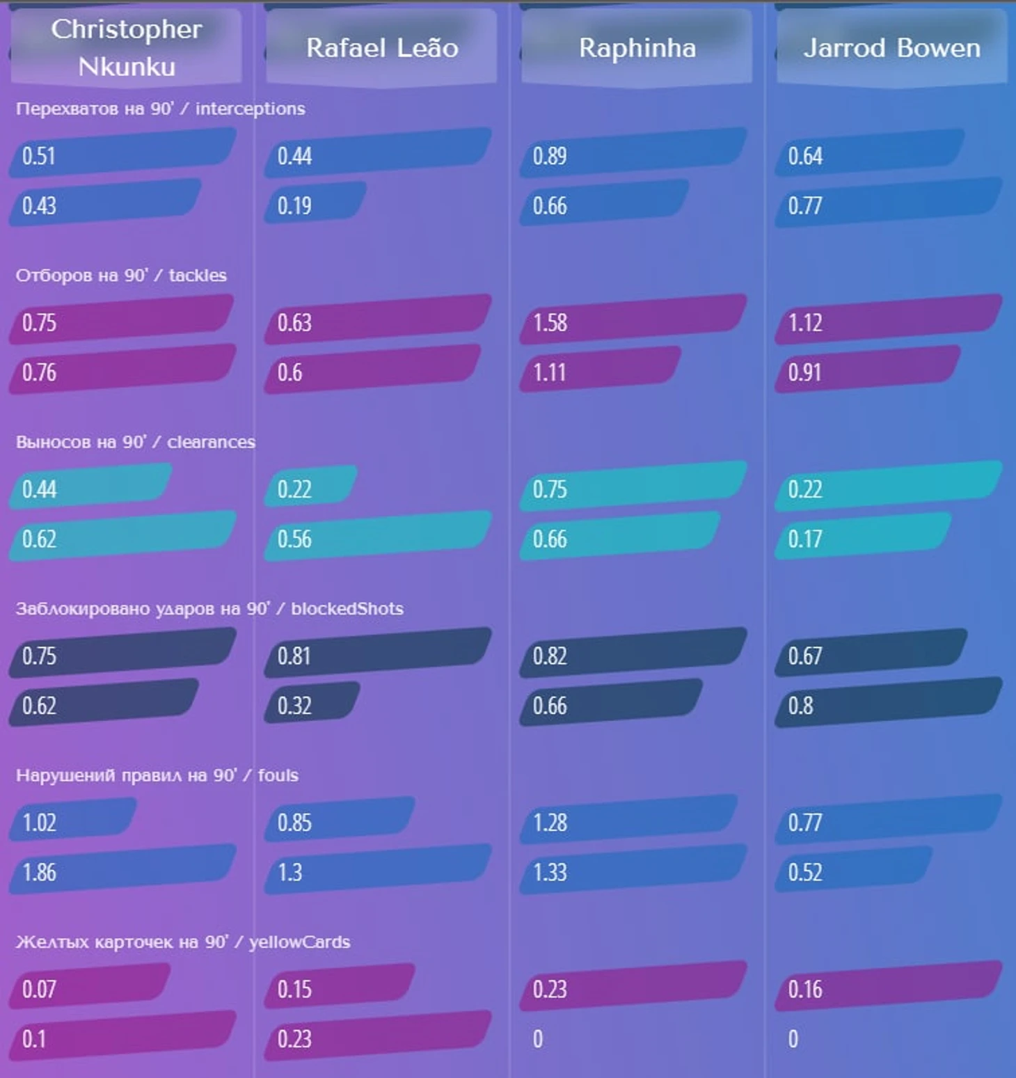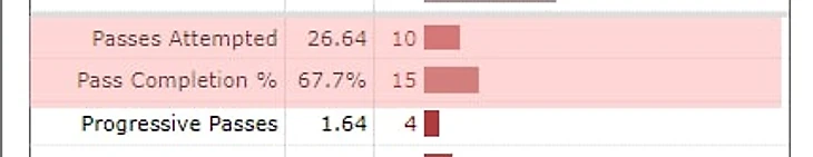 По многим основным показателям Рафинья играет чуть выше среднего. При этом у него чудовищный показатель точности передач и при этом высокие цифры по прогрессивным передачам.