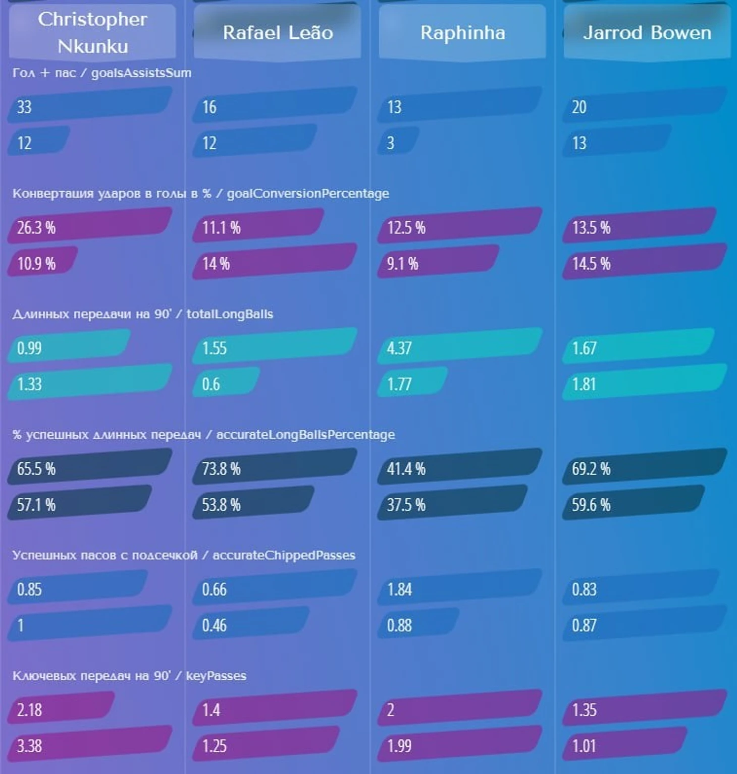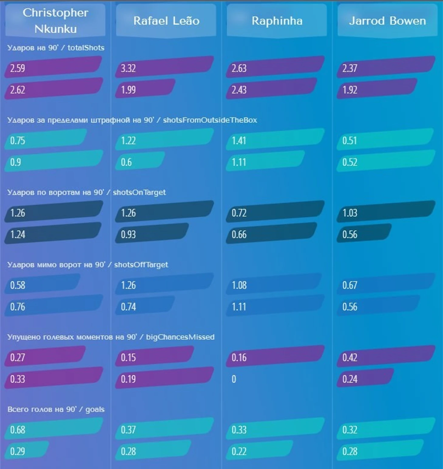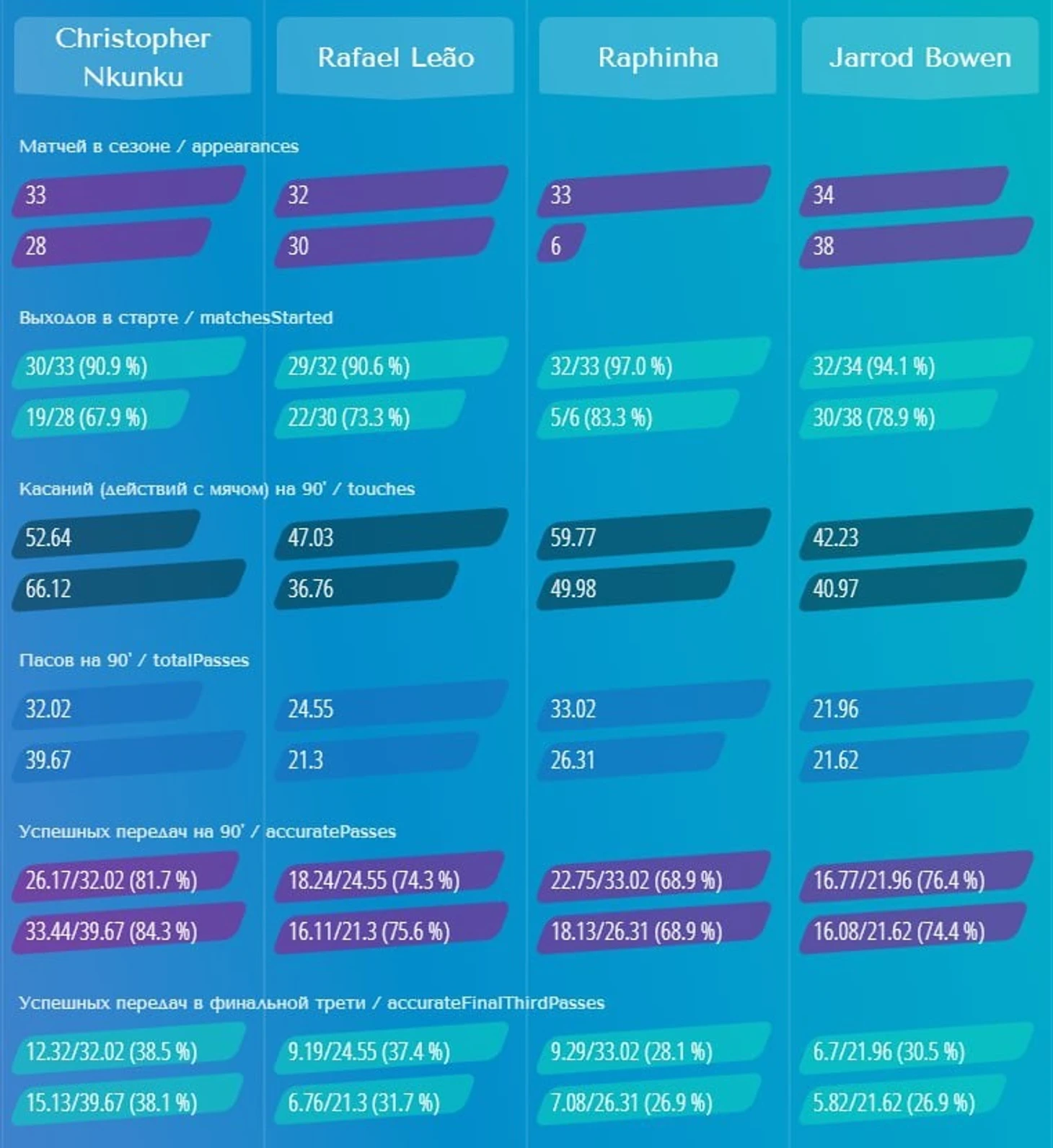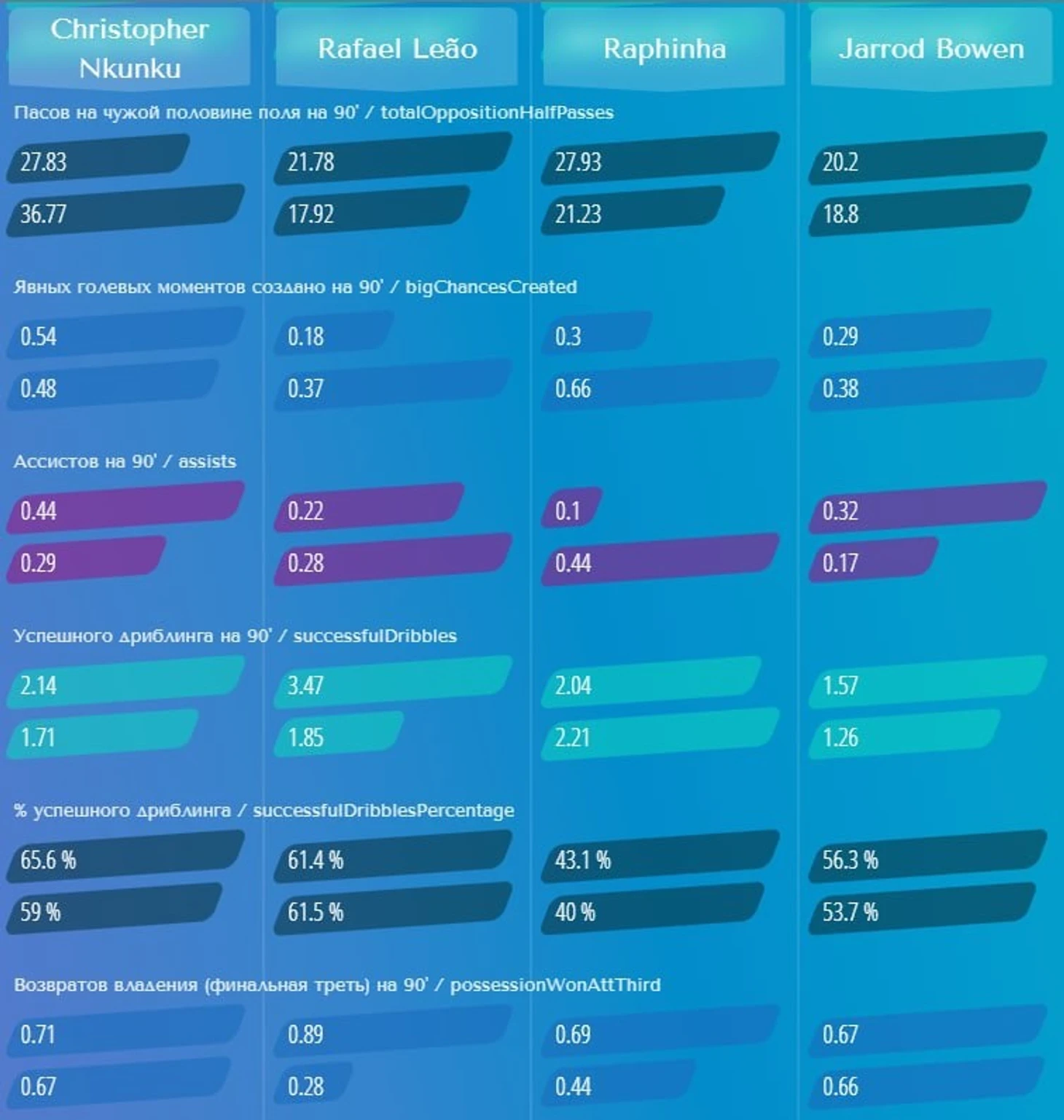 У Леао выросли количество и точность передач в финальной трети, ничем иным особо первые два игрока за последние два сезона не выделились.