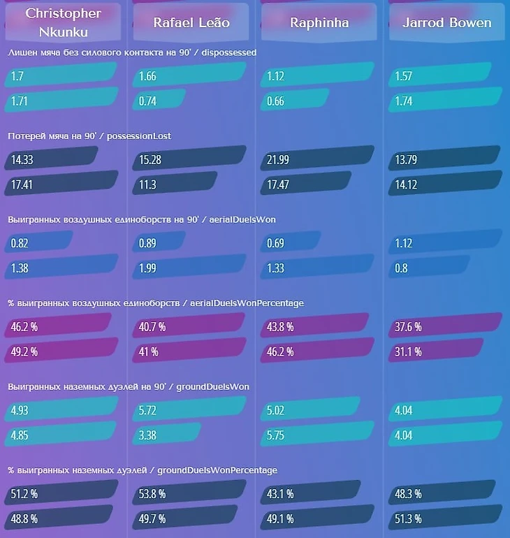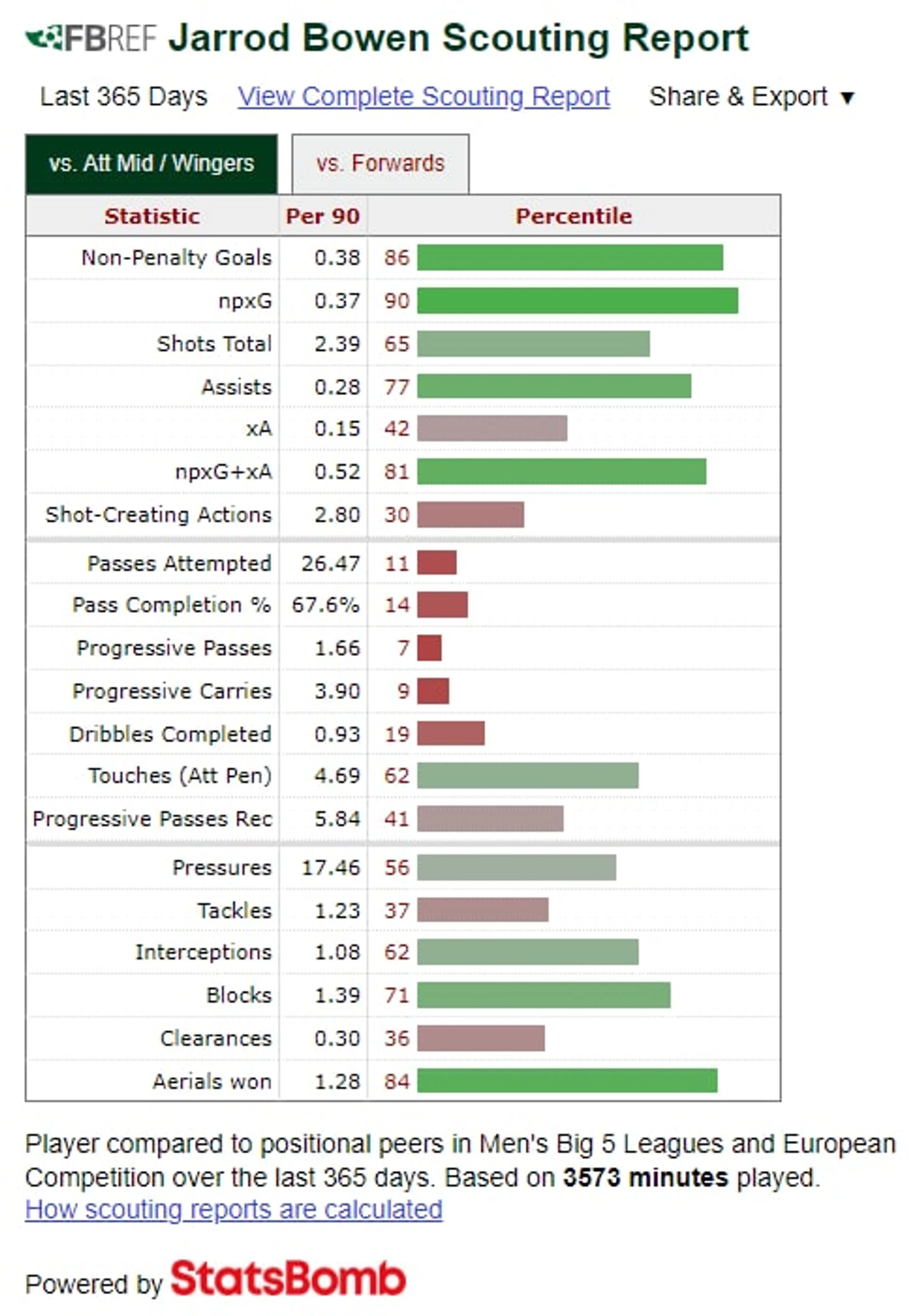 Впрочем, кроме Боуэна. Этот игрок, по цифрам FBref, со своим показателем 1.12 выигранных дуэлей в АПЛ (а во всех турнирах — 1.21) играет лучше 80% игроков. Для вингера — это отлично.