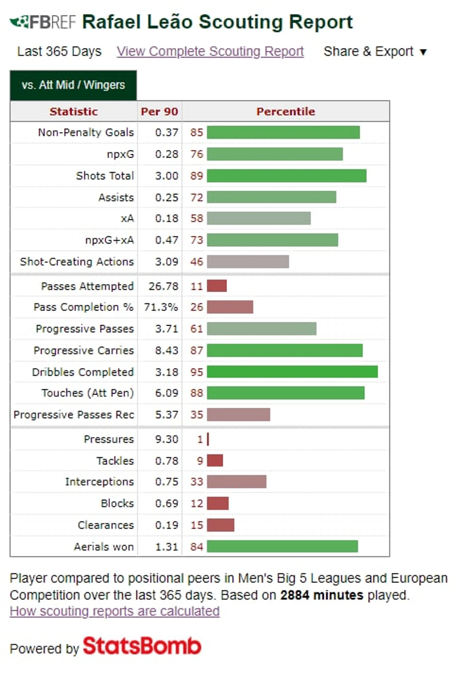 Также мы отмечали его дриблинг, а FBref дополняет: в прогрессивных проходах (тащить мяч на дриблинге к чужим воротам) Леао лучше 95% игроков.