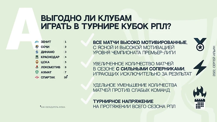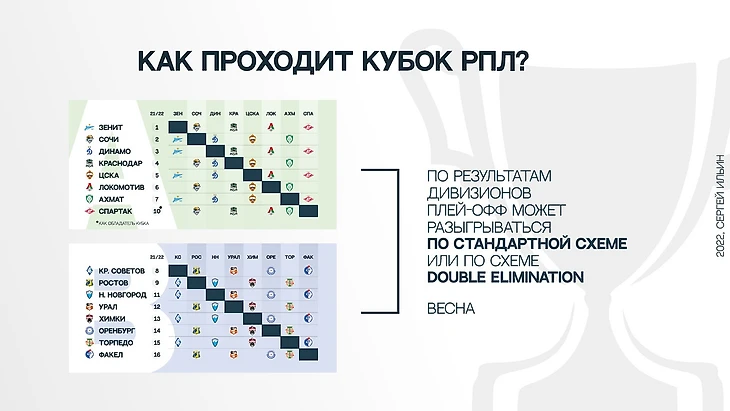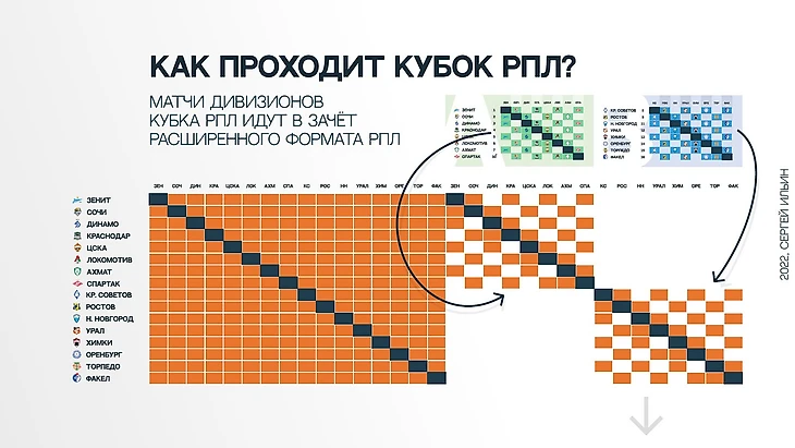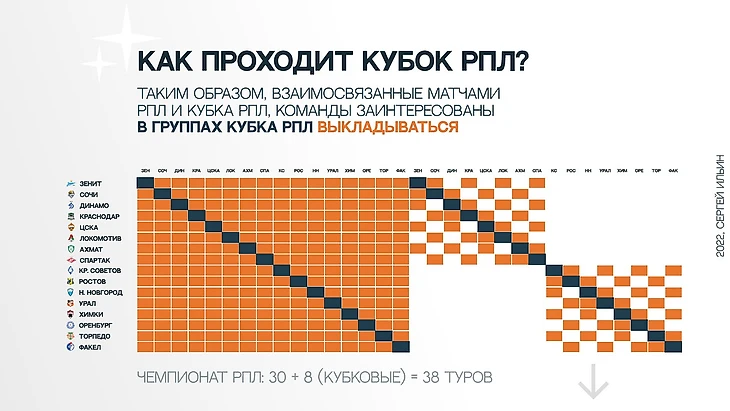 Наша команда предоставила в рабочую группу РПЛ по формату Кубка РПЛ оригинальный вариант альтернативного формата группового турнира, поднимающего спортивную составляющую на максимальный уровень. Части из нашей презентации мы показываем здесь.