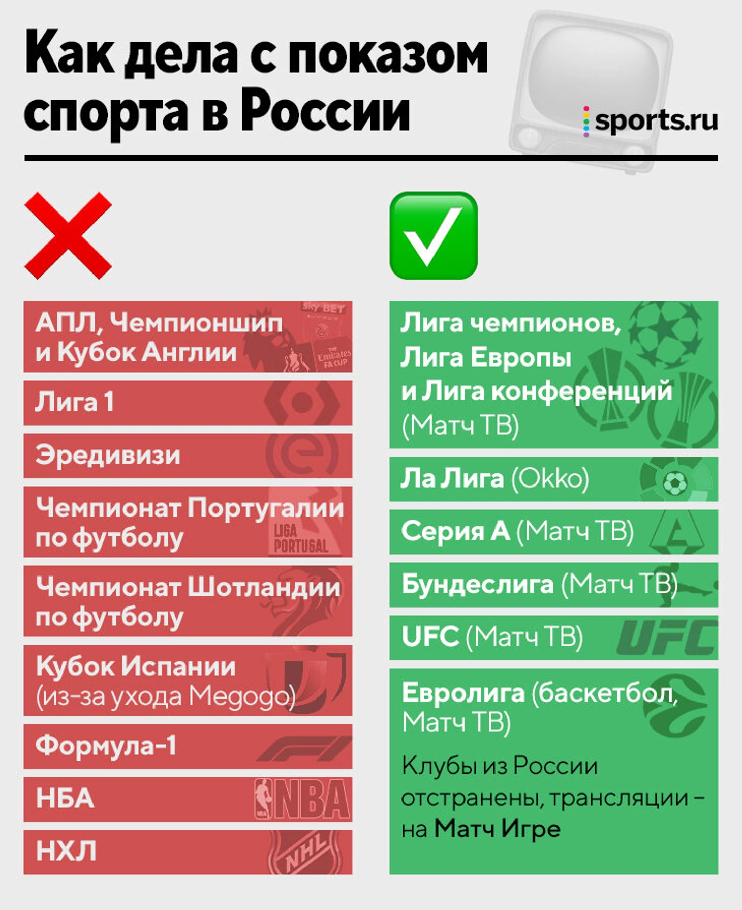 Пока что «Матч ТВ» сохранил права на UFC и на баскетбольную Евролигу (там не участвуют российские команды).