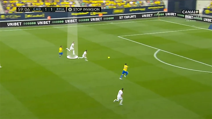 Милитао все делает правильно: выбирает позицию и перекрывает направление движения, но просто промахивается по мячу и досматривает эпизод как зритель.