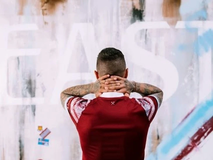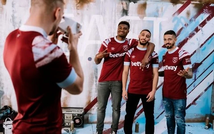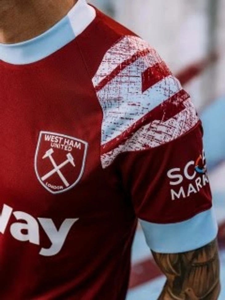 Лондонский клуб будет играть в домашних футболках традиционных цветов с принтом под граффити. На воротнике, конечно, молотки.